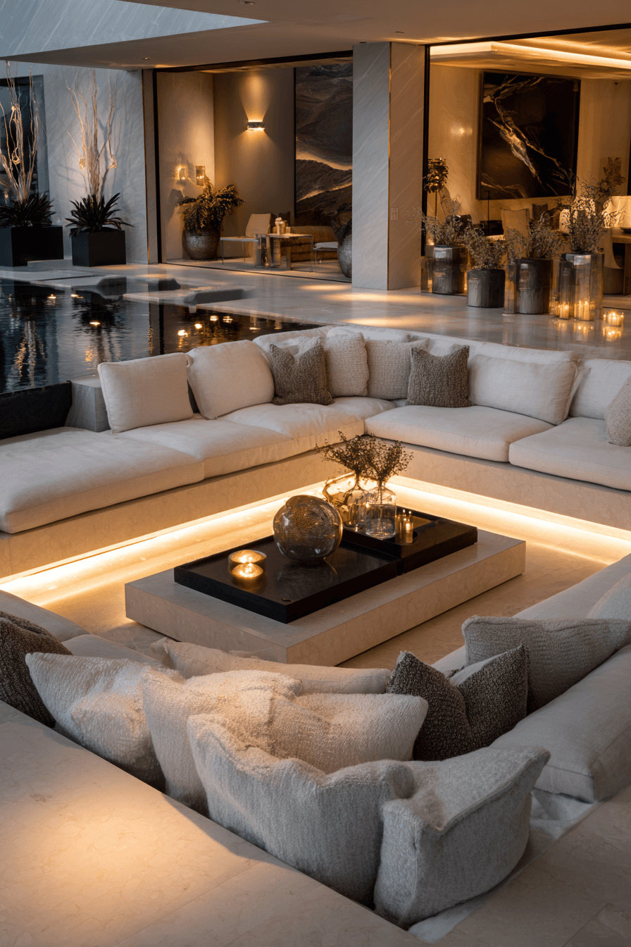 A sunken seating area creates architectural intimacy within this modern luxury living room. Plush cushions encourage connection. Clean lines maintain contemporary polish. Integrated lighting defines the lowered zone. The balance between bold layout and comfort feels perfect. Tap to explore how a conversation pit can redefine your modern luxury living room!
