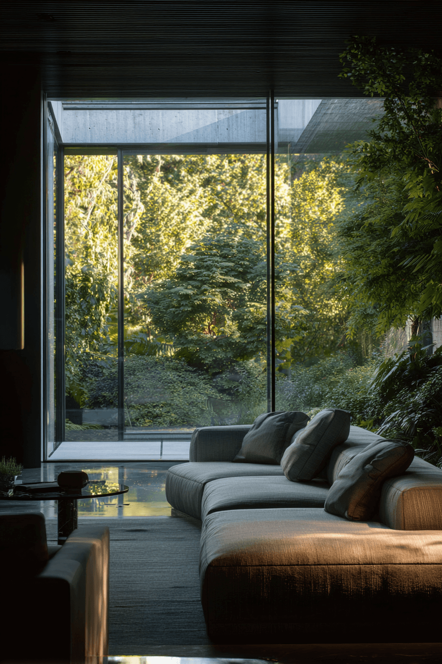 Large glass doors connect this modern luxury living room to lush greenery beyond. Nature becomes part of the design. Sleek furnishings maintain a refined interior. Neutral tones keep the outdoor view central. Layered lighting enhances both environments. Tap to see how biophilic design can elevate your modern luxury living room!
