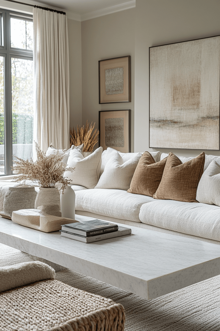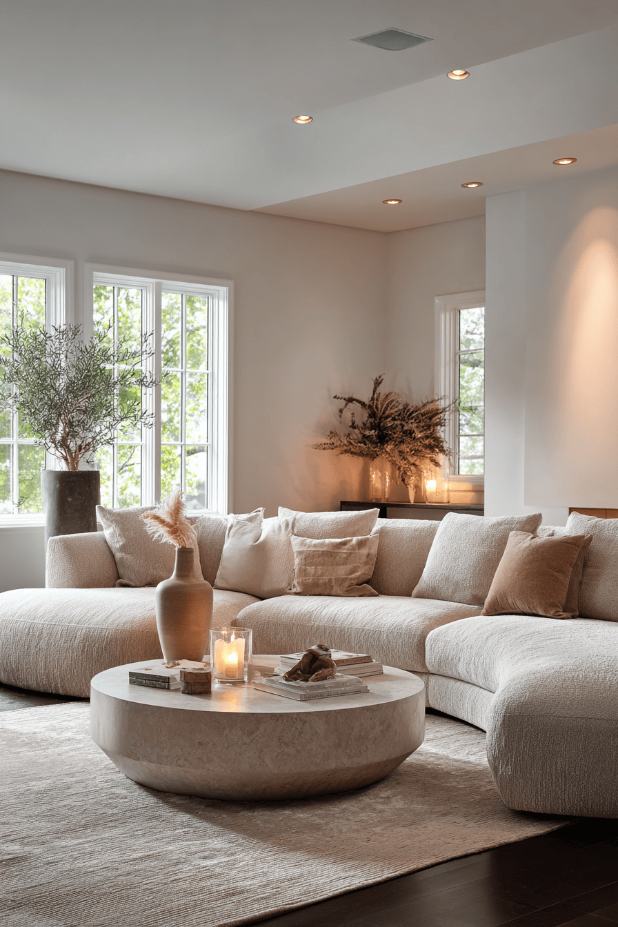 A layered neutral palette defines this serene modern luxury living room. Cream, ivory, taupe, and soft gray build depth without bold color. Boucle, linen, and plush textiles add tactile richness. Clean architectural lines maintain a contemporary edge. The space feels timeless and cohesive. Tap to bring calm sophistication into your modern luxury living room!