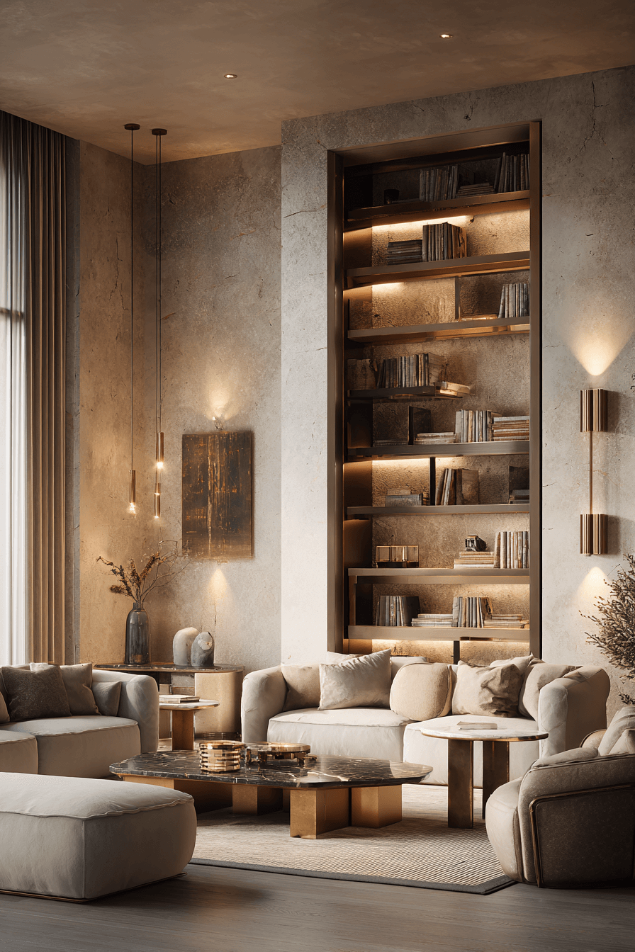Warm bronze accents introduce a refined glow to this modern luxury living room. Subtle metallic details on shelving, lighting, and furniture legs add depth. Neutral upholstery balances the warmth effortlessly. Layered lighting highlights the bronze without overpowering the design. Comfort and sophistication blend seamlessly. Click to see how bronze touches can elevate your modern luxury living room!
