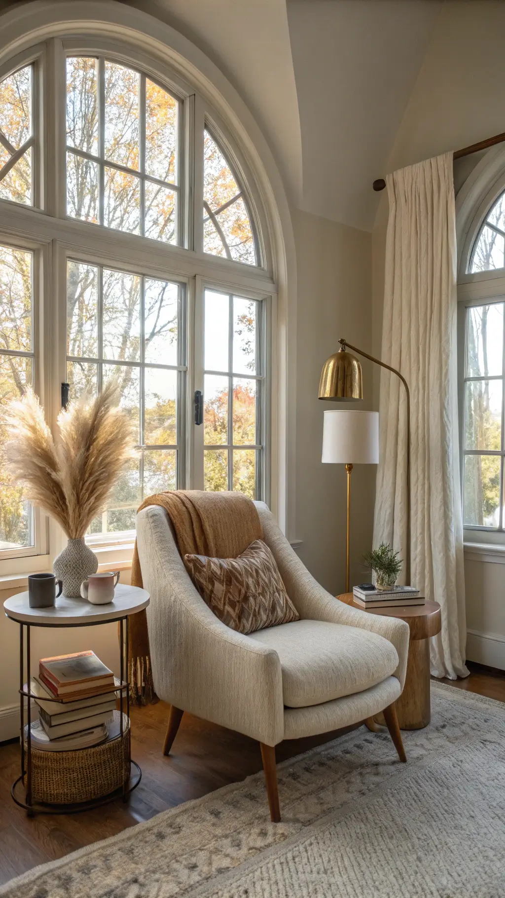 A woven rug in warm tones or natural fiber carpet grounds the space and adds warmth underfoot.