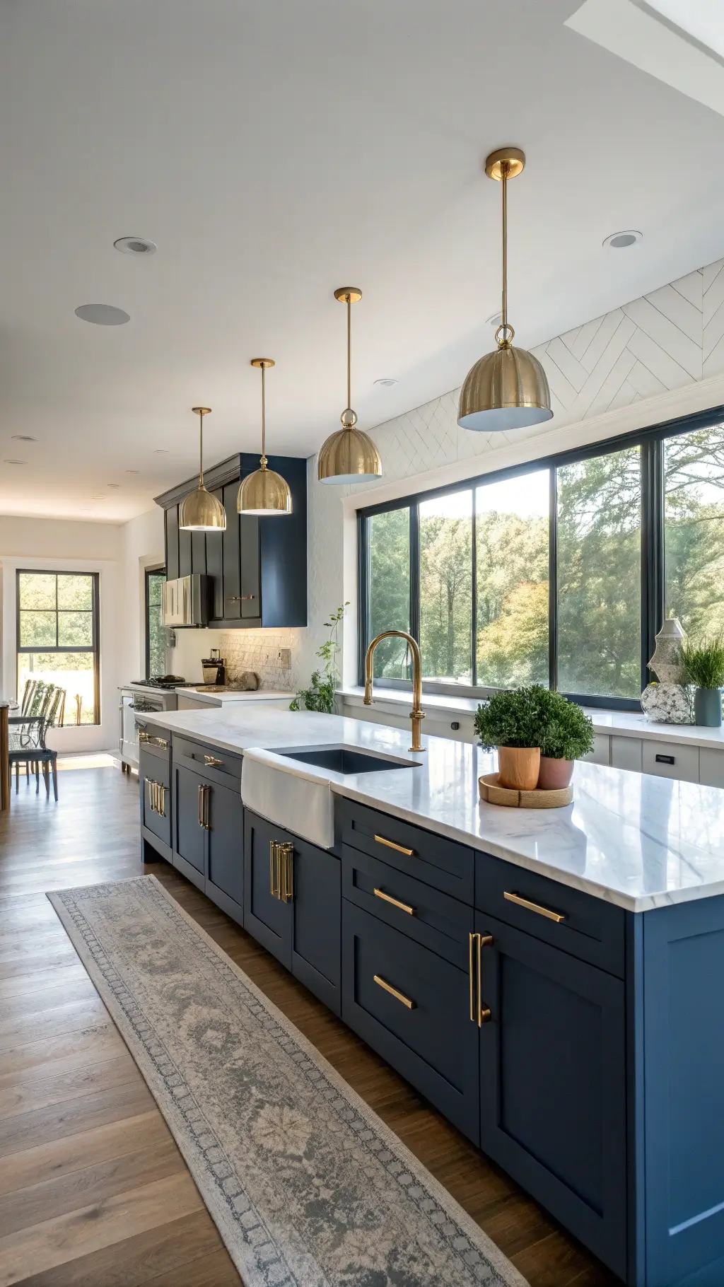 Spacious modern navy kitchen bathed in golden hour light, featuring navy blue shaker cabinets, Carrara marble-topped island, brass pendant lights and styled with copper cookware and fresh herbs.