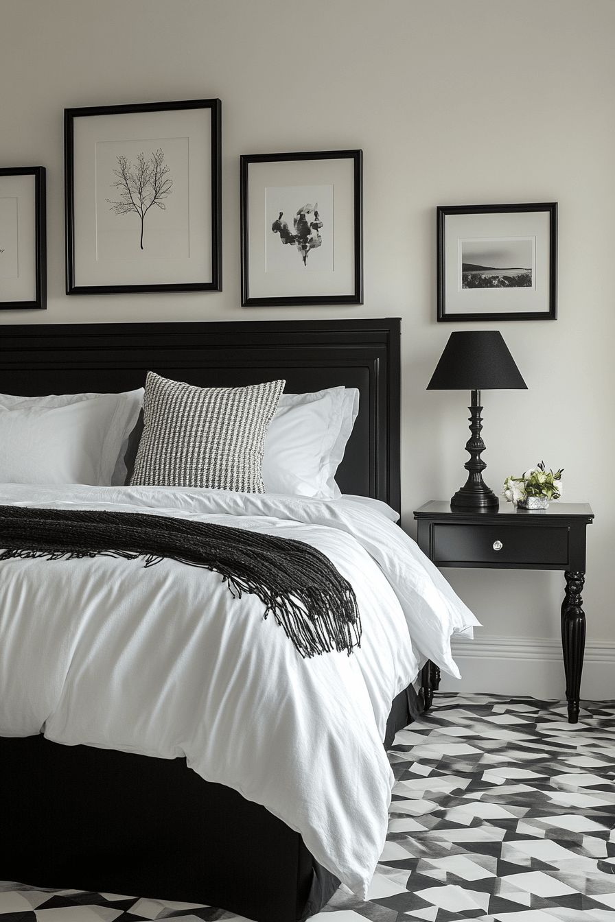 High-contrast black and white styling brings graphic drama to this Neo Deco bedroom. Crisp lines and glossy accents emphasize structure and movement. Metallic touches introduce subtle warmth to the bold palette. The interplay of light and dark feels timeless yet daring. The room commands attention without excess ornamentation. Click to embrace striking contrast with confidence!