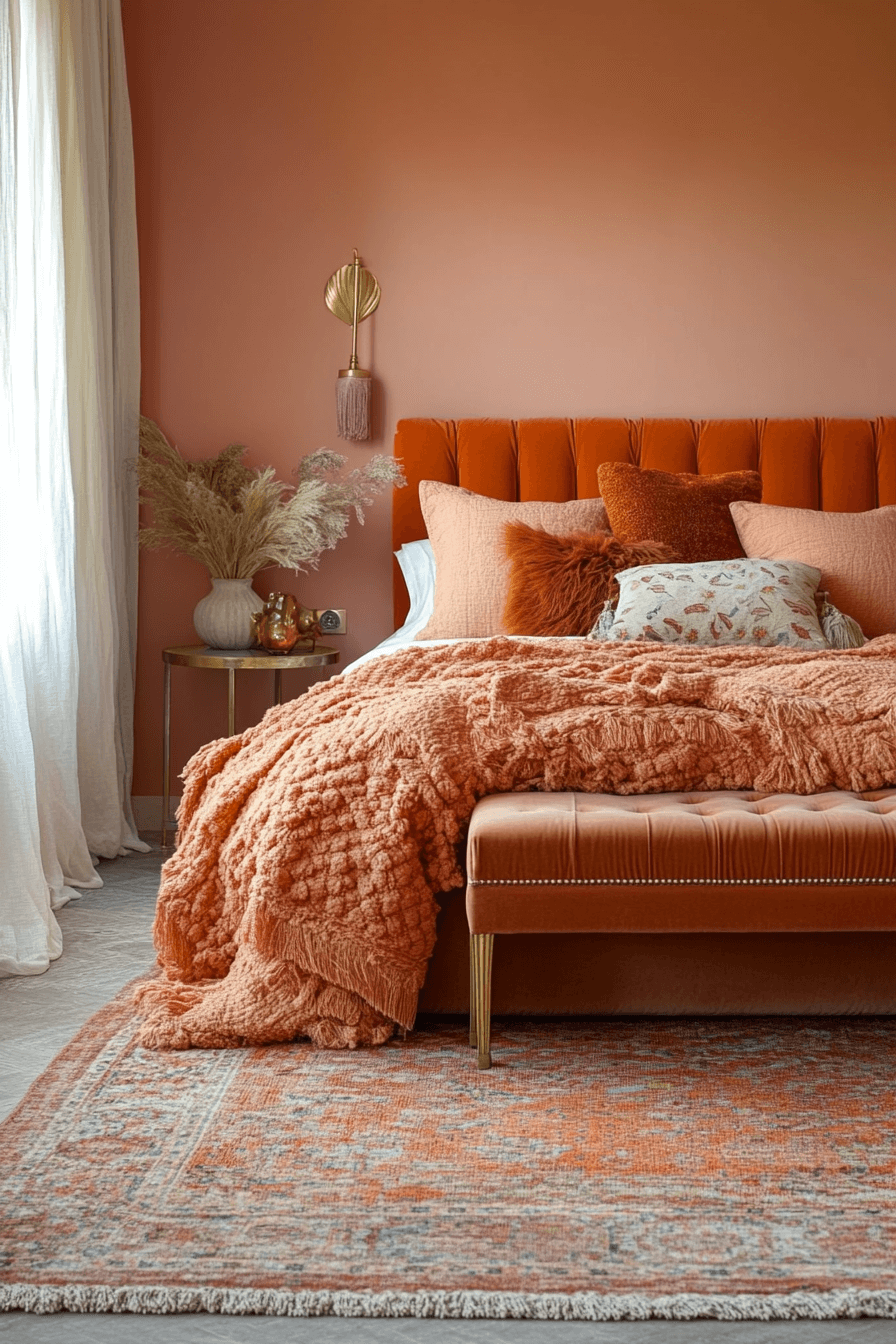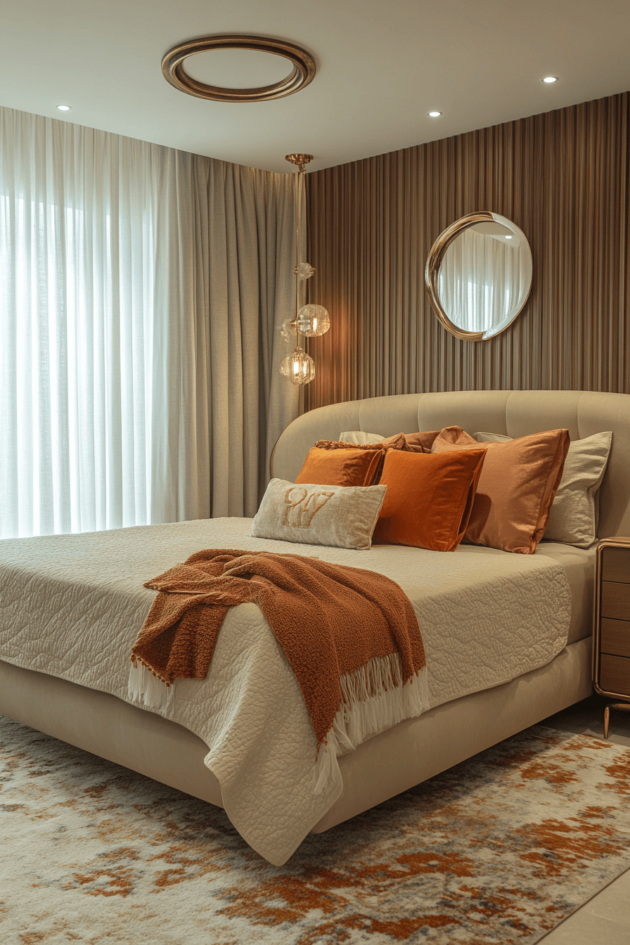 Warm rust, peach, and muted gold tones infuse this Neo Deco bedroom with inviting radiance. Earthy hues soften geometric furnishings beautifully. Metallic highlights echo the warmth of sunset light. The design balances cozy comfort with architectural precision. The result feels intimate yet polished. Tap to wrap your bedroom in golden warmth!