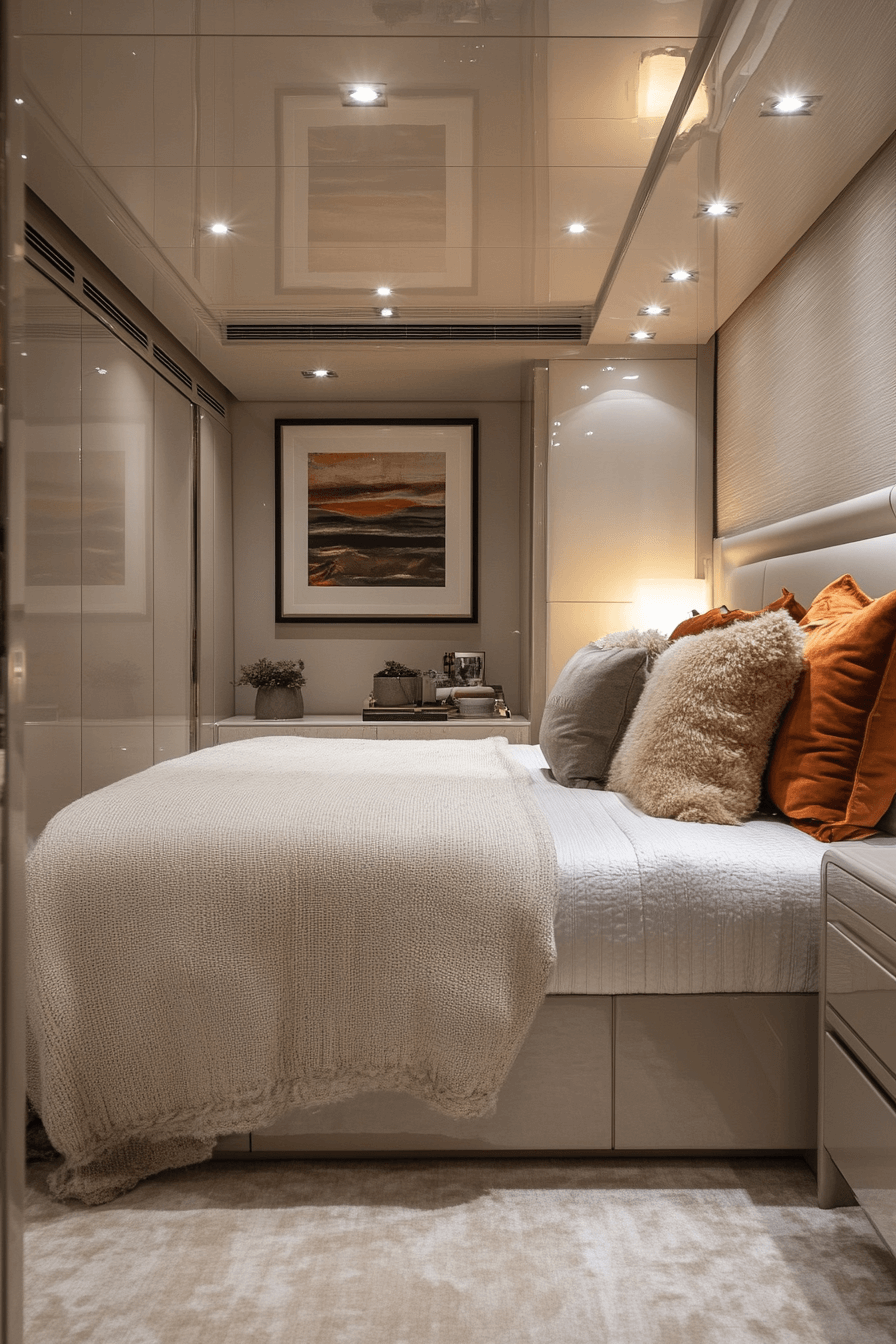 Glossy lacquered finishes elevate this glamorous Neo Deco bedroom with radiant sheen. Reflective wardrobes and polished tables amplify brightness. Soft textiles counterbalance the shine for cohesive harmony. The combination feels upscale yet approachable. Glossy surfaces modernize Deco-inspired forms effortlessly. Tap to add luminous polish to your retreat!