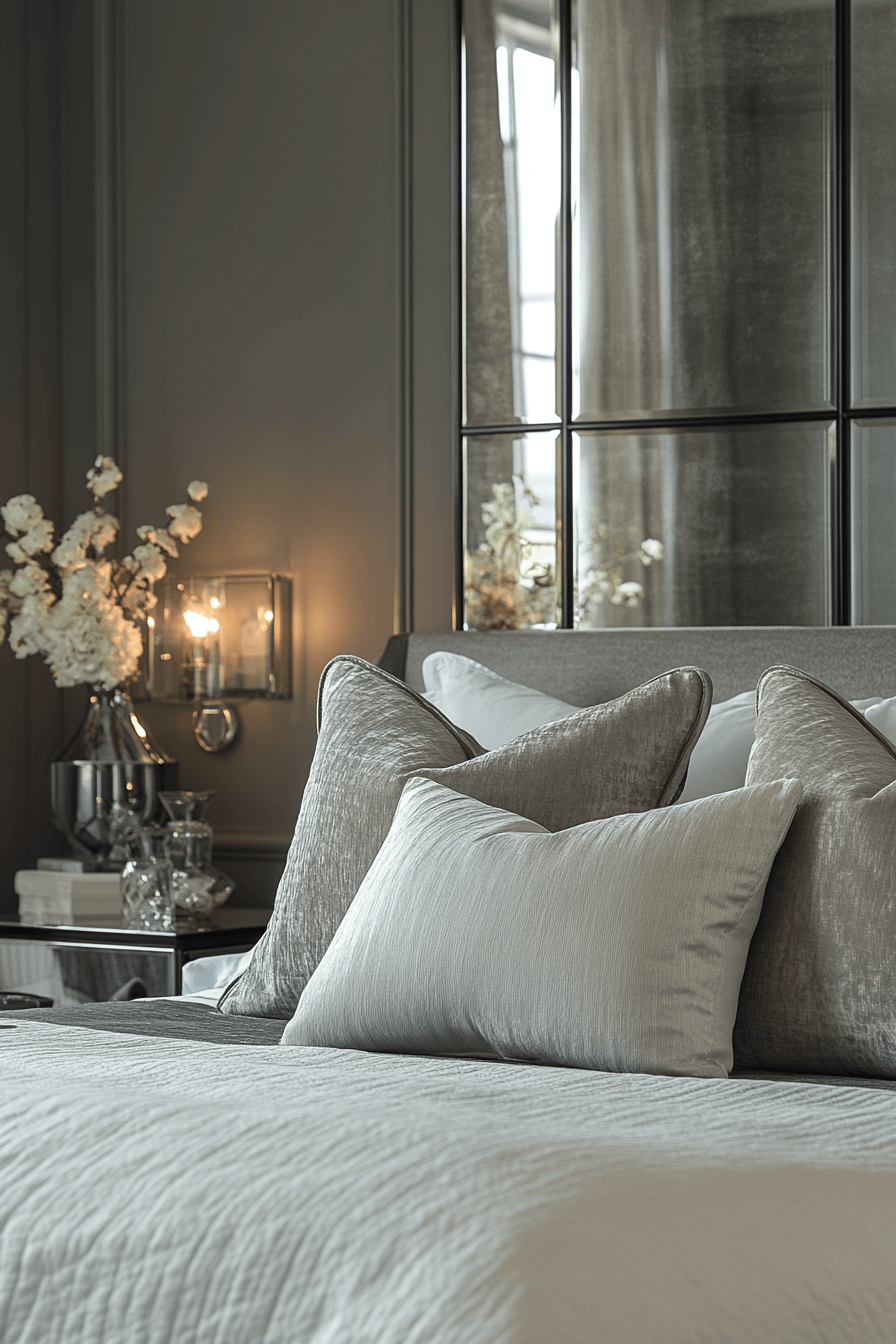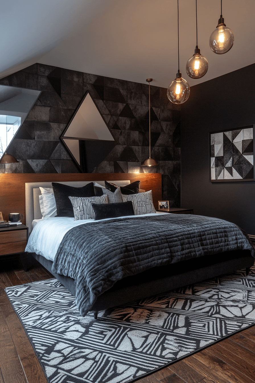 Smoky mirrors and reflective accents bring dimensional depth to this atmospheric Neo Deco bedroom. Layered lighting enhances the shimmer without overwhelming the senses. Dark frames introduce graphic contrast against neutral textiles. The space feels dramatic yet serene—perfect for winding down. Reflective surfaces make even smaller layouts feel expansive. Tap to explore this luminous, mirror-kissed retreat!