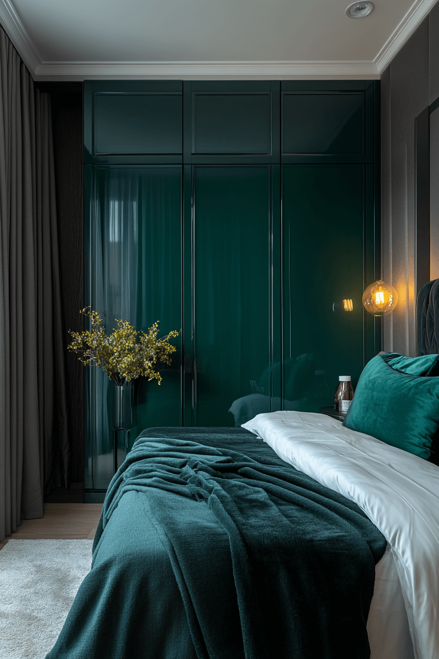 Decadent jewel tones—emerald, sapphire, and amethyst—infuse this Neo Deco bedroom with rich personality. Velvet textures and gilded accents heighten the luxurious mood. Clean lines prevent the saturated palette from feeling excessive. The contrast between depth and shimmer feels bold yet elegant. The space radiates curated glamour. Tap to immerse your retreat in vibrant sophistication!