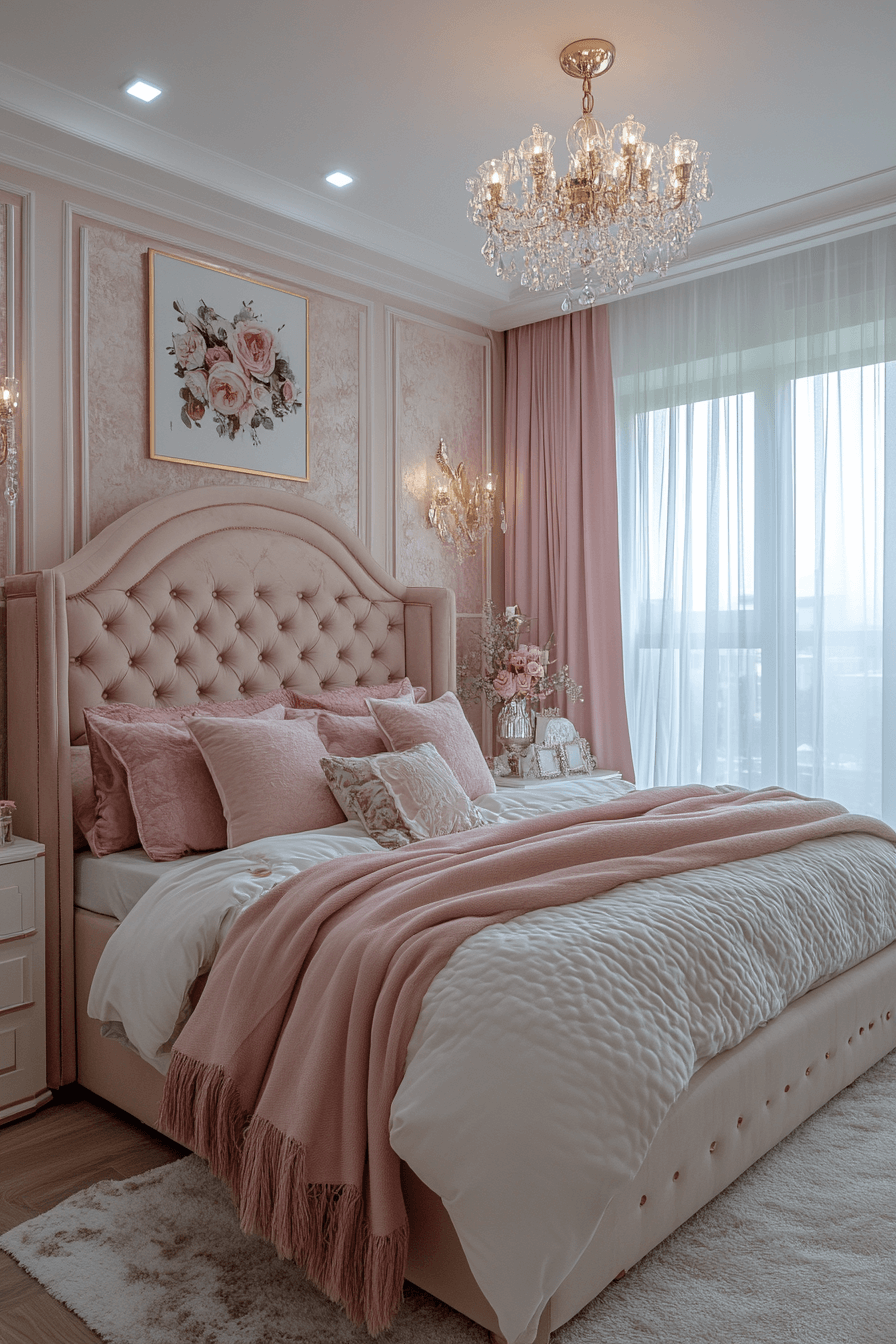 Soft blush tones illuminated by warm brass accents breathe life into this Neo Deco bedroom vision. The gentle color tempers structured furniture, creating romantic balance. Metallic highlights add glow without overpowering the softness. Curved décor elements subtly reference Deco tradition in a fresh way. The atmosphere feels feminine, confident, and contemporary. Tap to refresh your bedroom with radiant charm!
