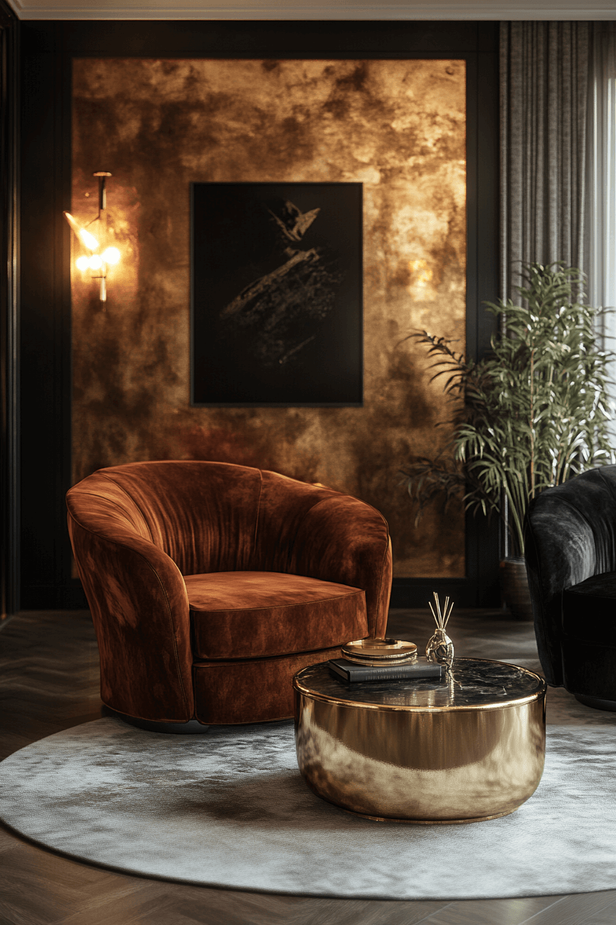 Tactile richness defines Neo Deco interior design when plush velvet meets warm brass accents. Soft upholstery layered with glowing metallic fixtures creates an atmosphere that feels indulgent yet approachable. The pairing adds depth, warmth, and refined character to seating areas, dining spaces, and entryways alike. Vintage inspiration blends seamlessly with modern polish for a look that feels both nostalgic and current. The contrast between plush texture and sleek shine creates irresistible visual interest. Tap to introduce this sumptuous pairing into your own interiors!