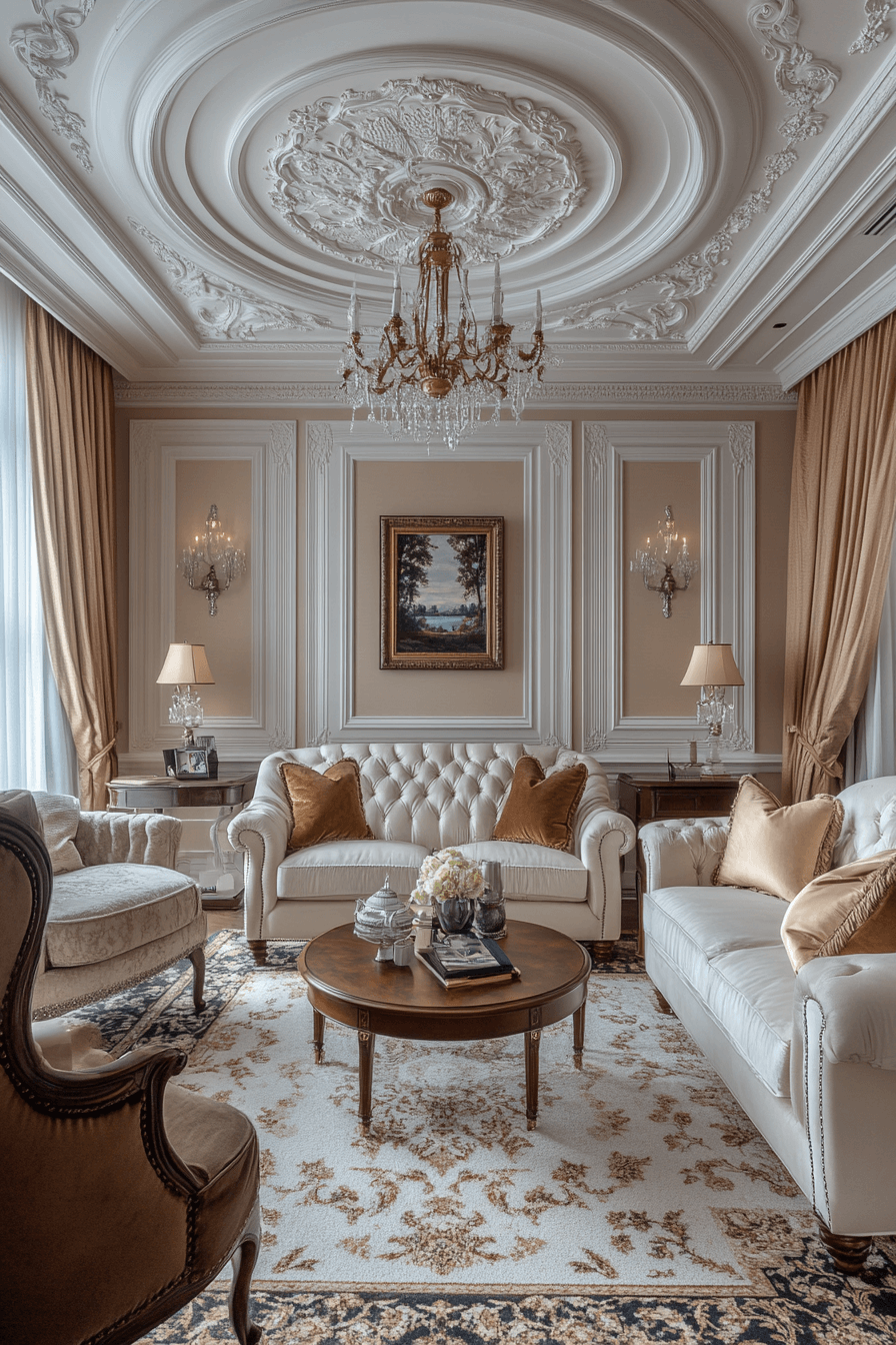Ceiling ornamentation introduces heritage charm into a neoclassical interior with sculptural medallions. These details frame lighting fixtures elegantly and emphasize vertical volume. Whether minimal or ornate, the medallion adds finish and depth overhead. Paired with streamlined chandeliers, the look bridges eras seamlessly. Attention shifts upward, celebrating proportion and form. Add timeless character above eye level.