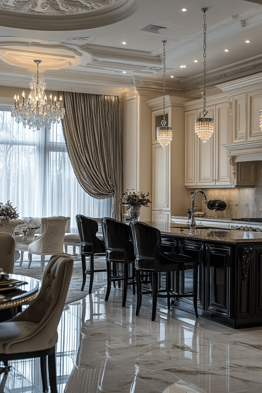 Polished finishes merge heritage elements with contemporary sheen in a neoclassical interior. Glossy trim and cabinetry reflect light against traditional forms. The contrast between sleek surfaces and intricate detailing feels intentional. This layered approach keeps the style relevant. Classical lines gain a modern edge without losing integrity. Blend history with modern polish effortlessly.