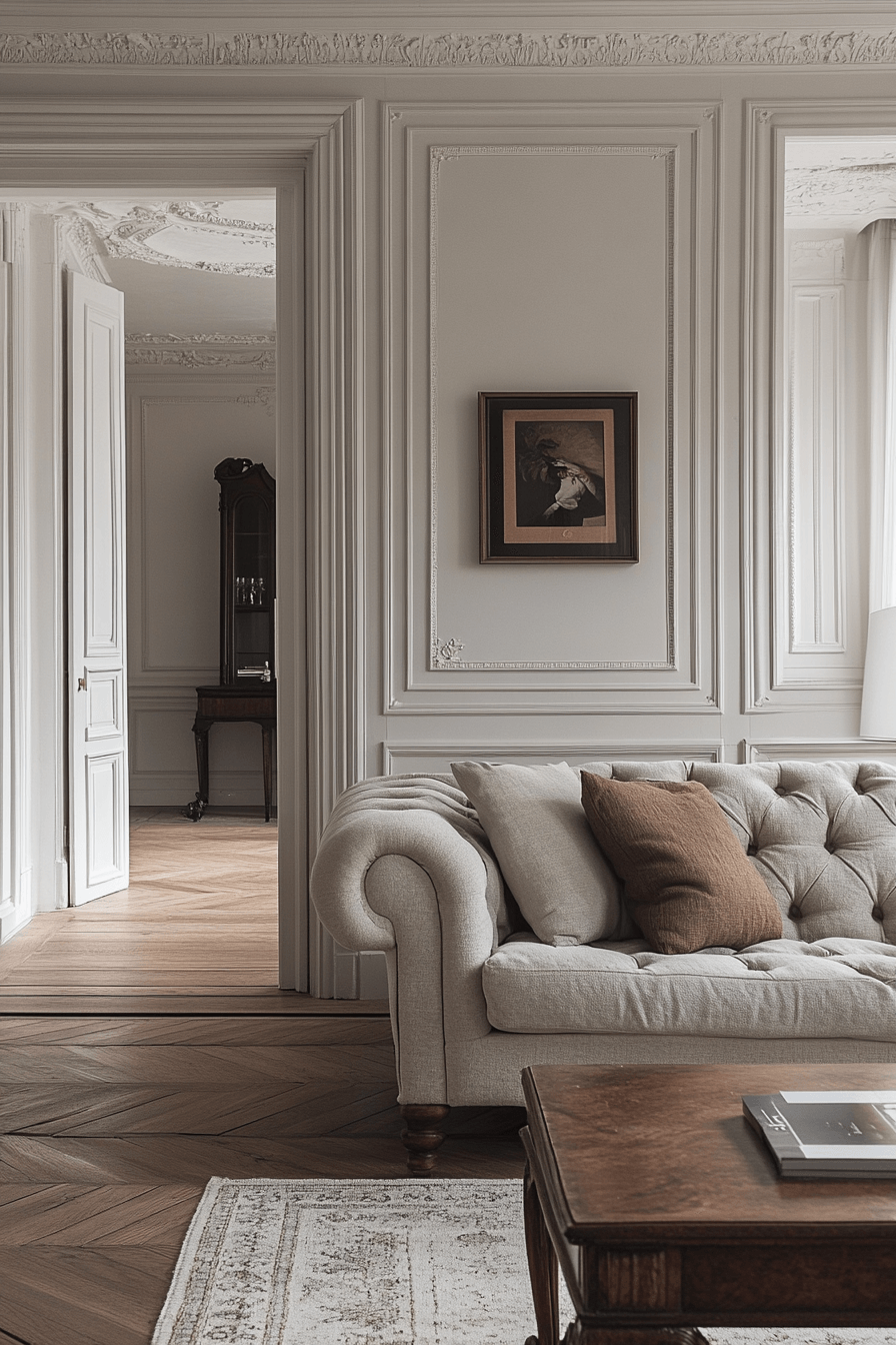 Dimensional wall framing introduces rhythm and structure to a neoclassical interior through carefully scaled paneling. The raised detailing echoes classical architecture while feeling fresh in modern settings. Painted in cohesive tones, the panels create elegant shadow play that enhances depth. Art and lighting stand out beautifully against this architectural backdrop. The result feels tailored, poised, and enduring. Explore the transformative power of structured walls.