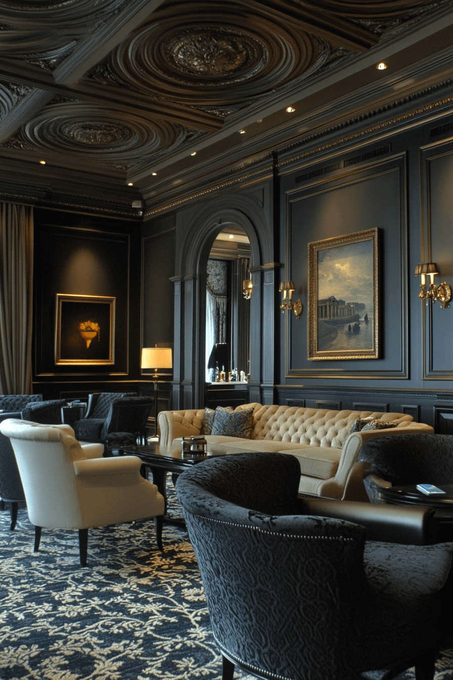Classic furniture shapes reimagined in contemporary fabrics refresh a neoclassical interior beautifully. Updated finishes breathe new life into traditional forms. The blend of old and new feels curated rather than nostalgic. Ornate backdrops highlight the contrast effectively. The space gains depth and character. See how reinvention enhances heritage.
