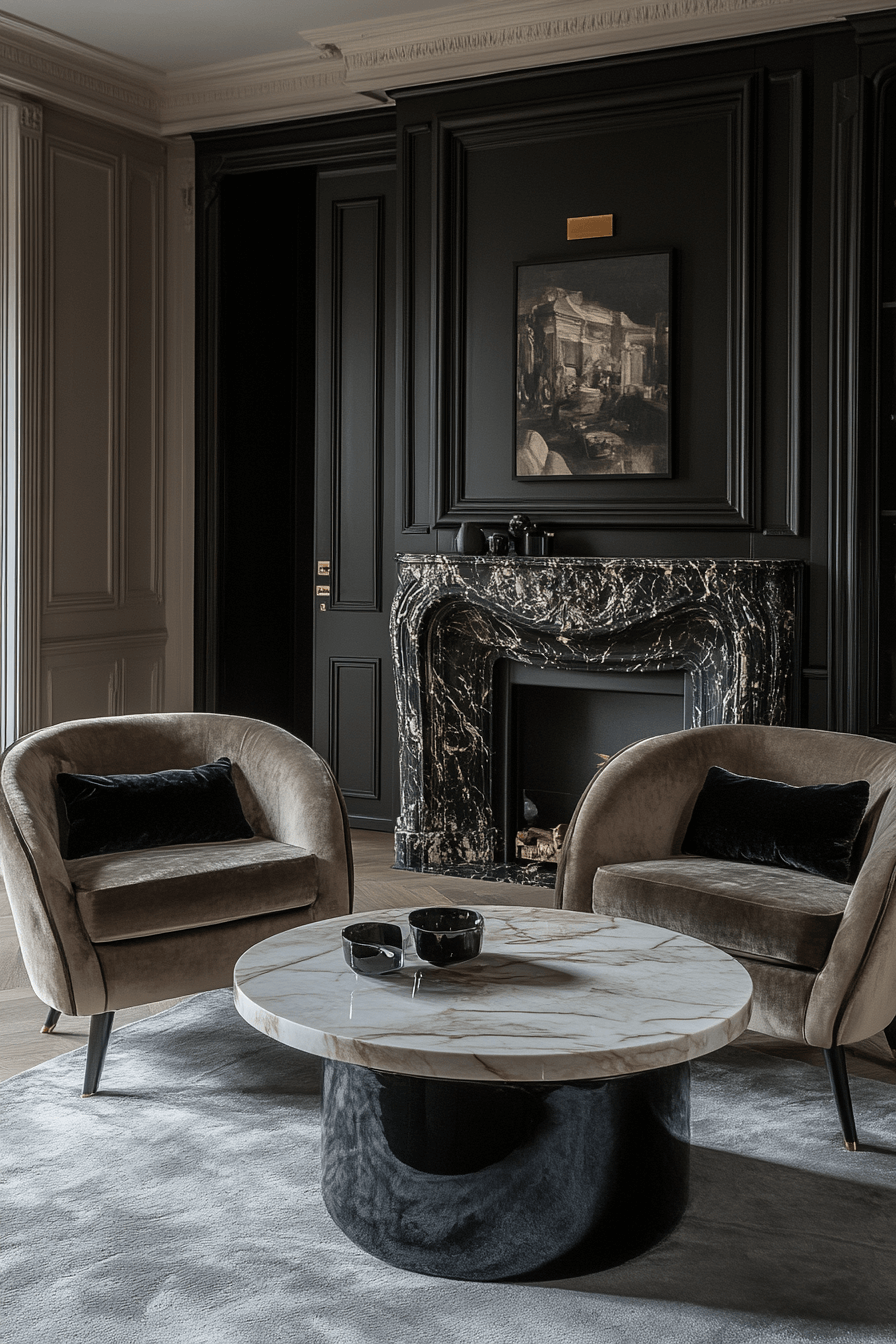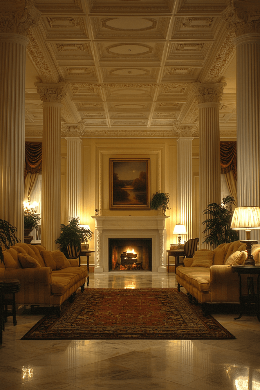A sculpted stone fireplace becomes the focal anchor of a neoclassical interior, drawing attention with elegant fluting and proportion. Vertical detailing enhances ceiling height and reinforces symmetry. The organic veining of marble contrasts with structured paneling for visual balance. This feature blends warmth with grandeur effortlessly. Classical inspiration meets contemporary polish in a seamless way. Reimagine your hearth as an architectural statement.