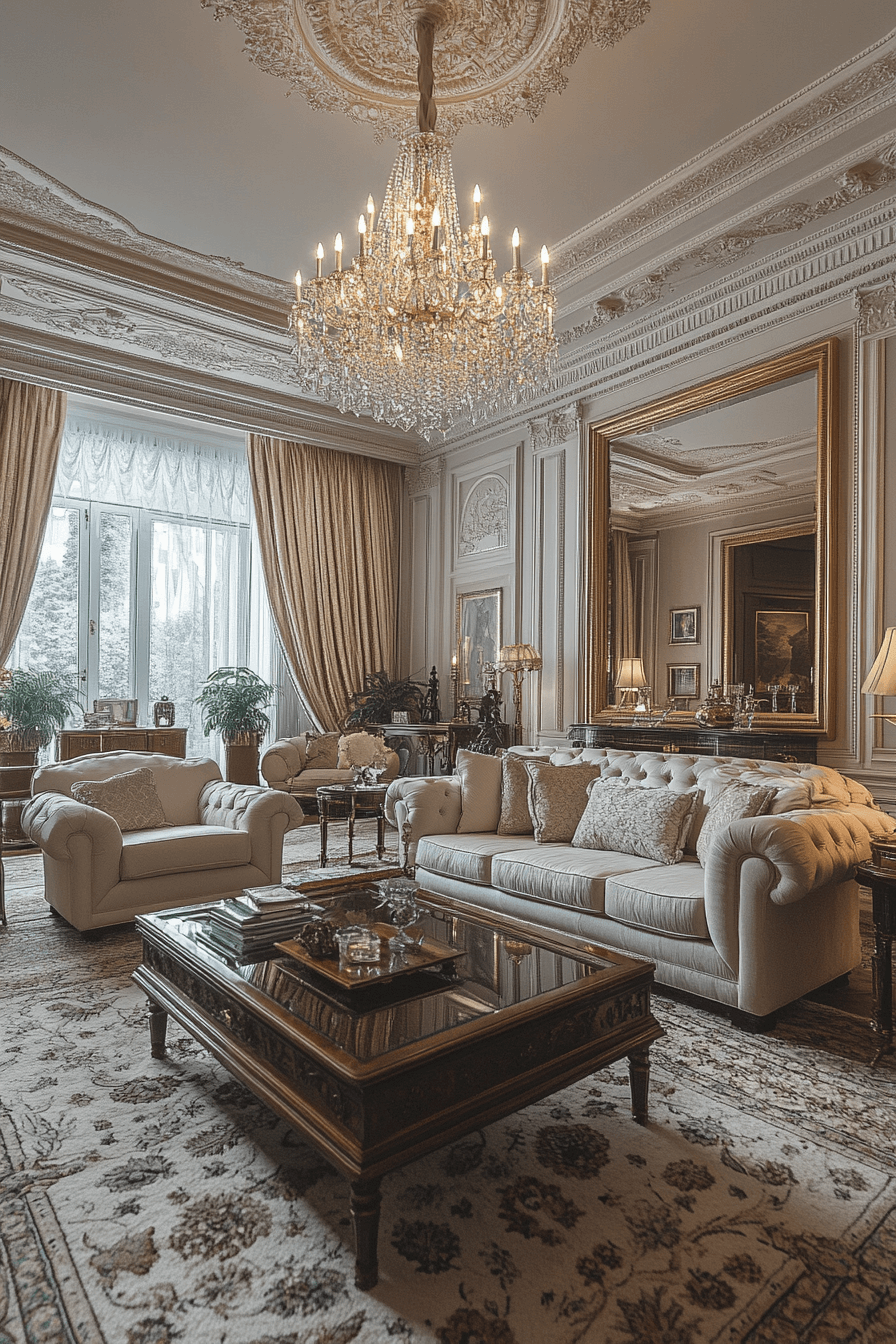 Oversized reflective surfaces amplify scale and symmetry within a neoclassical interior. Carved or gilded frames echo classical heritage while brightening the room. Mirrors enhance depth and double architectural impact. Positioned thoughtfully, they anchor focal points beautifully. Their presence feels balanced and grand. Reflect timeless elegance throughout your space.