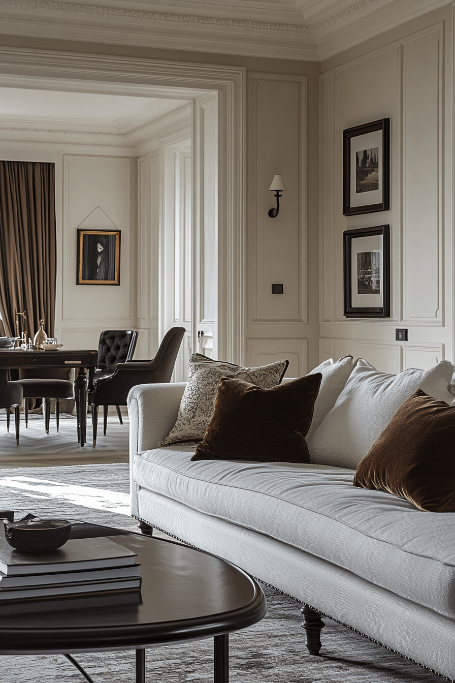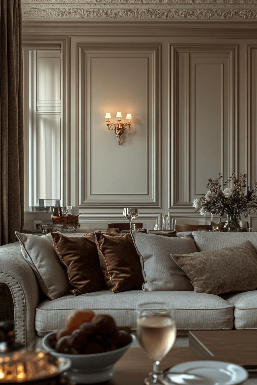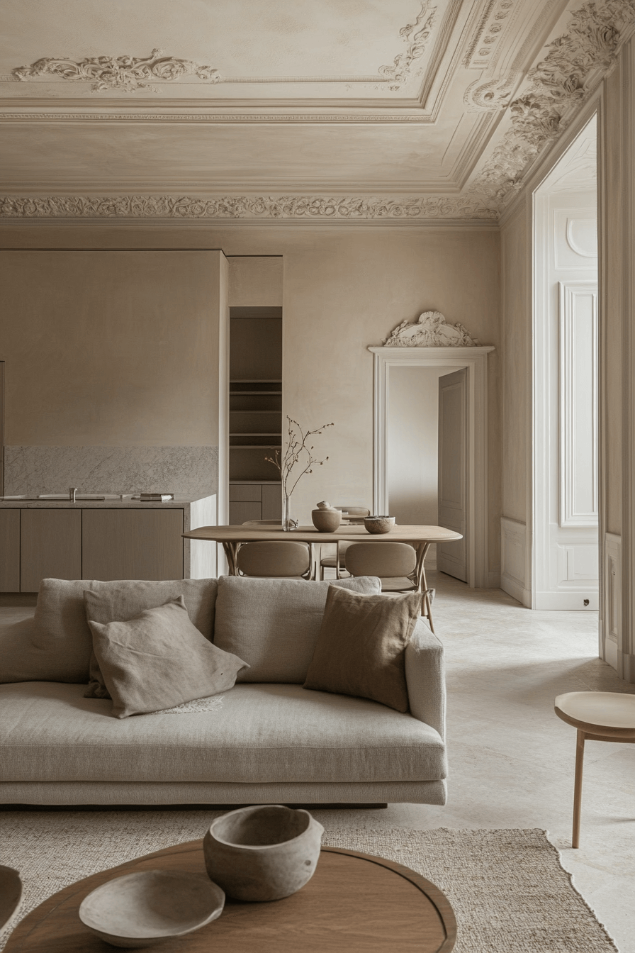 Restrained hues such as taupe and warm grey define a calm neoclassical interior focused on proportion. The subtle palette allows decorative elements to shine quietly. Architectural lines remain crisp and intentional. Layered textures prevent monotony. The ambiance feels tranquil yet sophisticated. Perfect your palette with quiet precision.