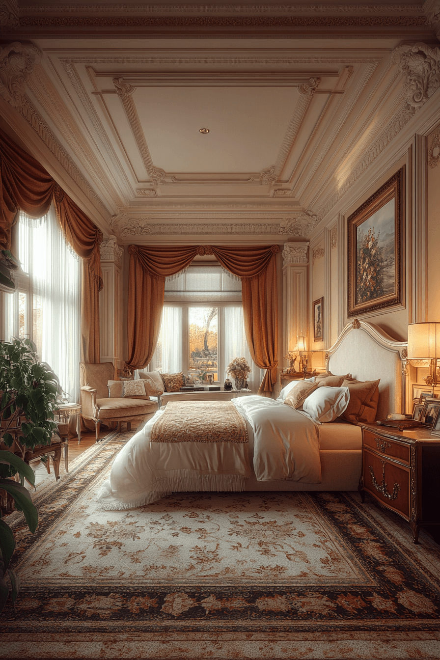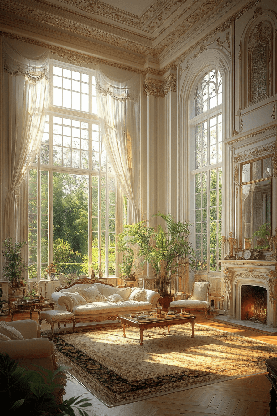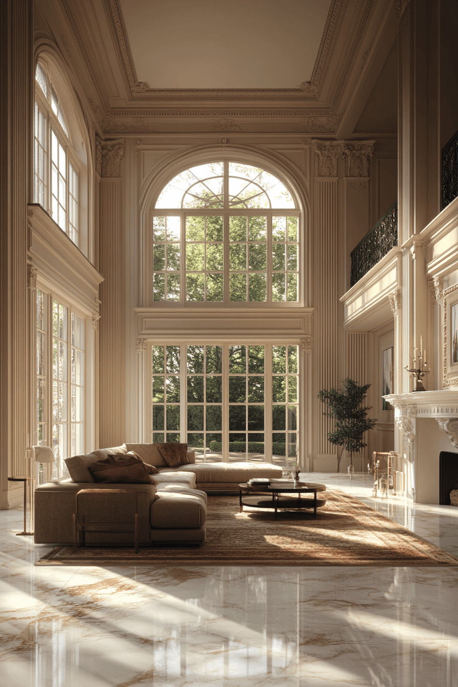 Abundant natural light softens architectural formality in a neoclassical interior. Sheer drapery filters brightness while preserving elegance. Moldings and trims glow gently under daylight. The room feels open yet structured. Airy ambiance balances classical order. Invite graceful light into your refined retreat.