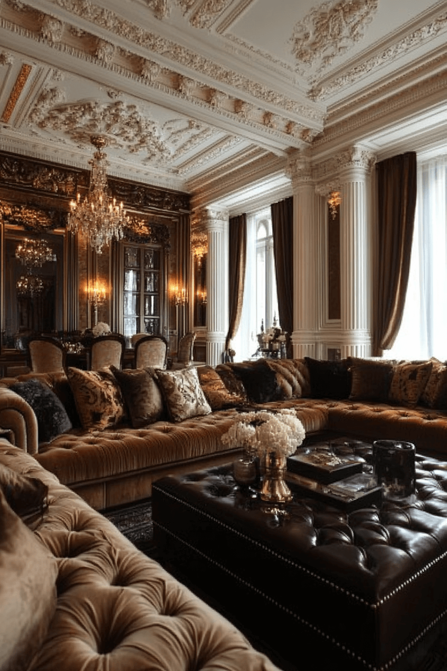 The pairing of stone and plush textiles enriches a neoclassical interior with tactile contrast. Marble surfaces add permanence while velvet layers introduce warmth. Together, they create cohesion between hard and soft materials. Ornate trim and paneling frame the materials beautifully. The result feels indulgent yet composed. Experience material harmony at its finest.
