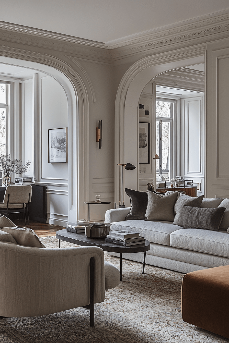 Graceful arch motifs soften linear architecture within a neoclassical interior, creating flow between rooms. These curved elements reference Roman influence while maintaining contemporary restraint. Integrated with crown molding and subtle trim, they frame views with sophistication. Natural light filters through arched transitions beautifully, amplifying their elegance. The balance of curve and line defines harmony. Bring sculptural softness into your classical spaces.