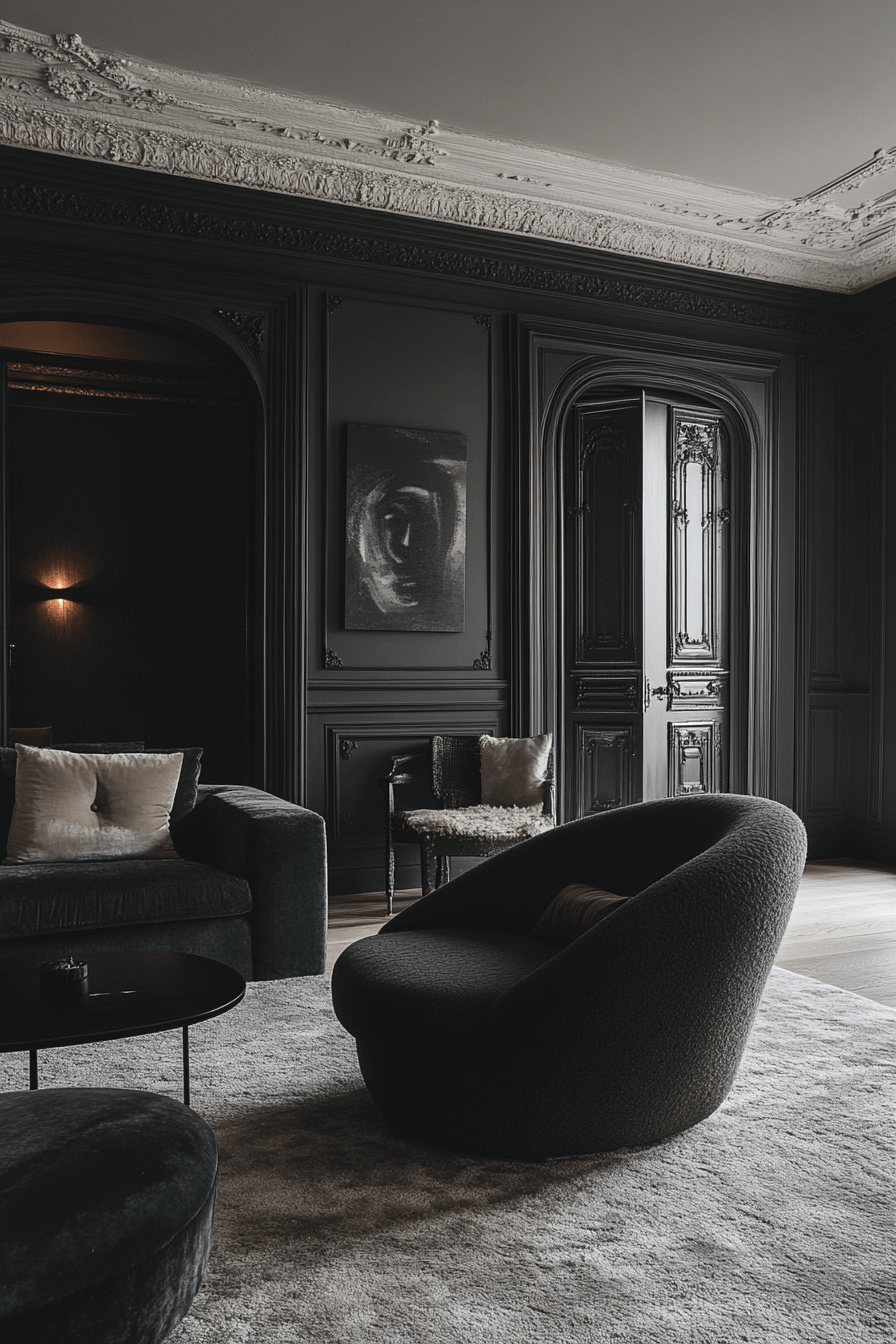 Curved seating silhouettes soften structured architecture within a neoclassical interior. Rounded sofas and sculpted armchairs introduce comfort and visual flow. The contrast between straight trim and gentle curves enhances dimension. Upholstered in linen or velvet, these pieces feel timeless. Balance between structure and softness defines the room. Invite graceful curves into classical living.