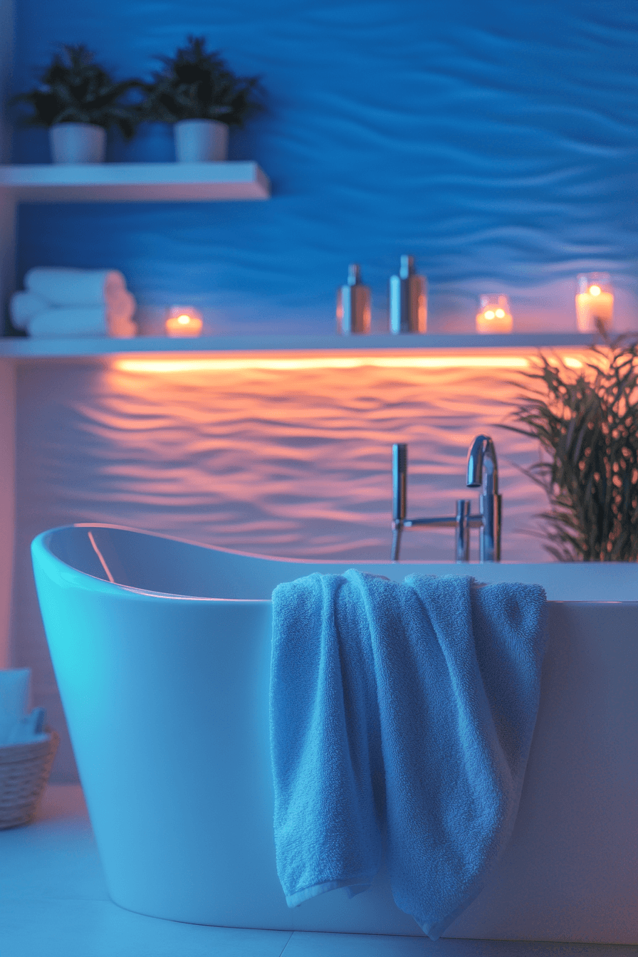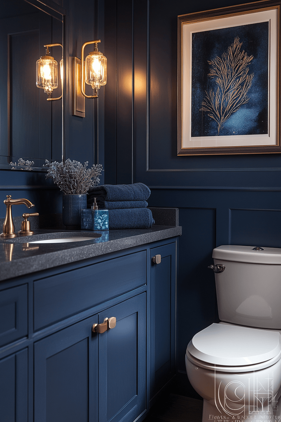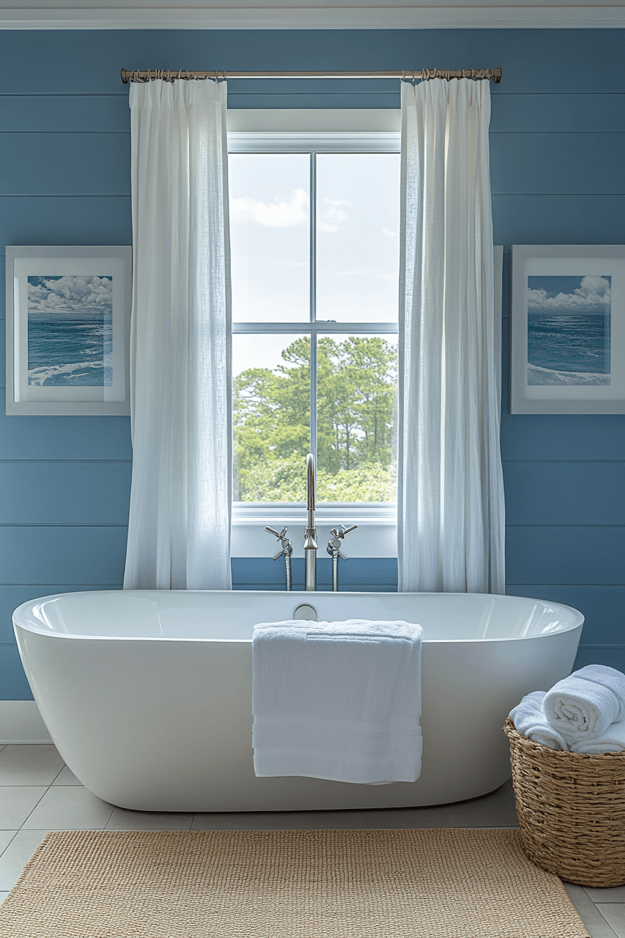Deep tones and rich contrast define this ocean themed bathroom, creating a bold and luxurious atmosphere. Navy walls highlight bright marble surfaces and warm metallic finishes beautifully. A freestanding tub becomes the centerpiece, adding spa-like elegance. Dark mosaic tiles reflect light subtly, adding shimmer and depth. Coastal accents are carefully styled to maintain a cohesive theme. The design feels dramatic yet refined. Elevate your bathroom with this bold coastal concept!