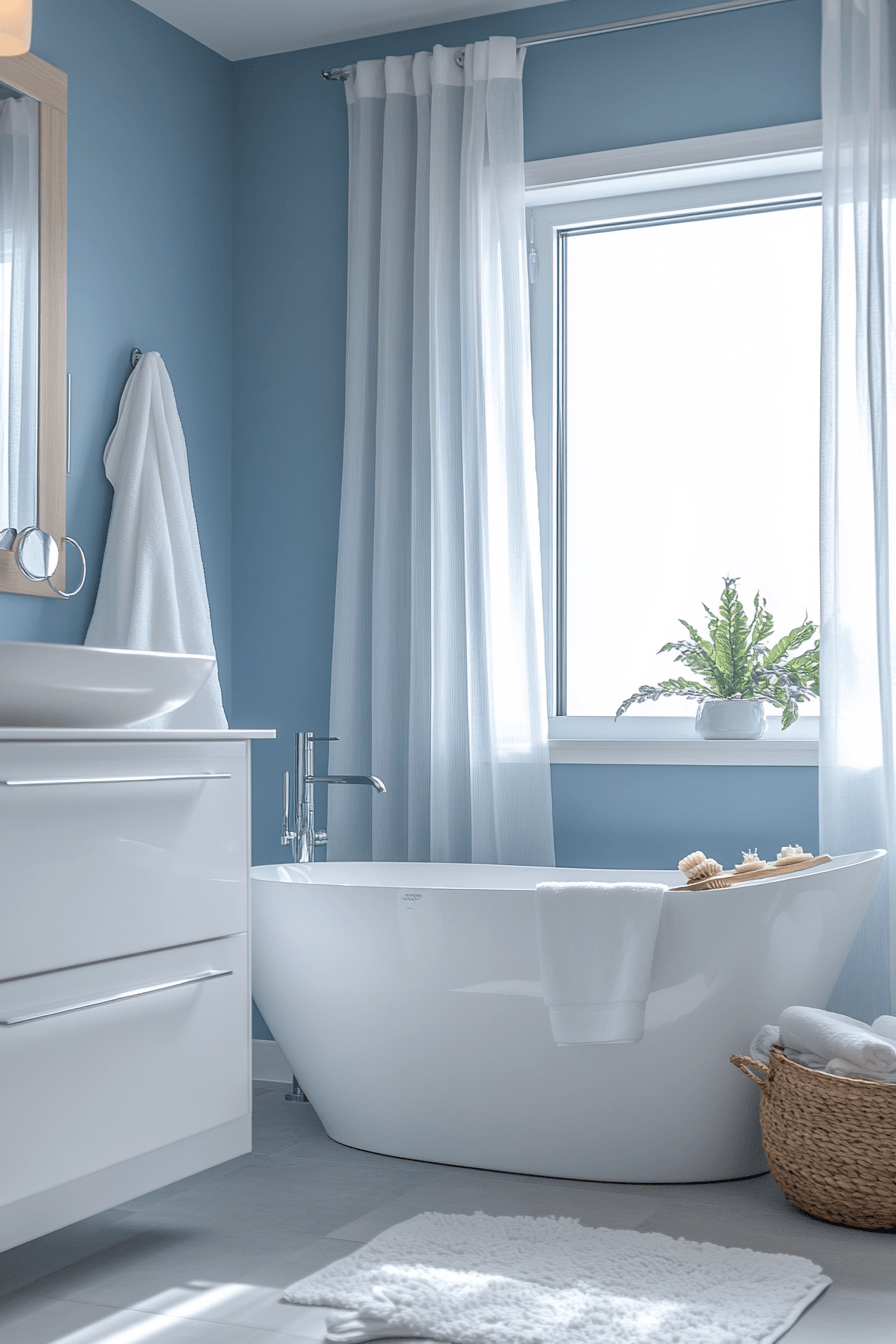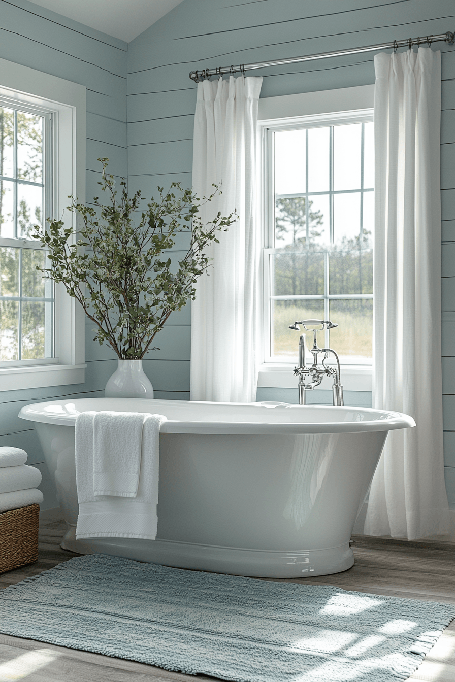 Soft gray-blue tones wrap this ocean themed bathroom in a peaceful, spa-like atmosphere. Smooth finishes and muted textures keep the look clean and calming. Pebble flooring in the shower adds an earthy element. A freestanding tub enhances the relaxing vibe. Gentle accents bring in subtle color. The design feels quiet and refined. Experience tranquility with this coastal-inspired space!