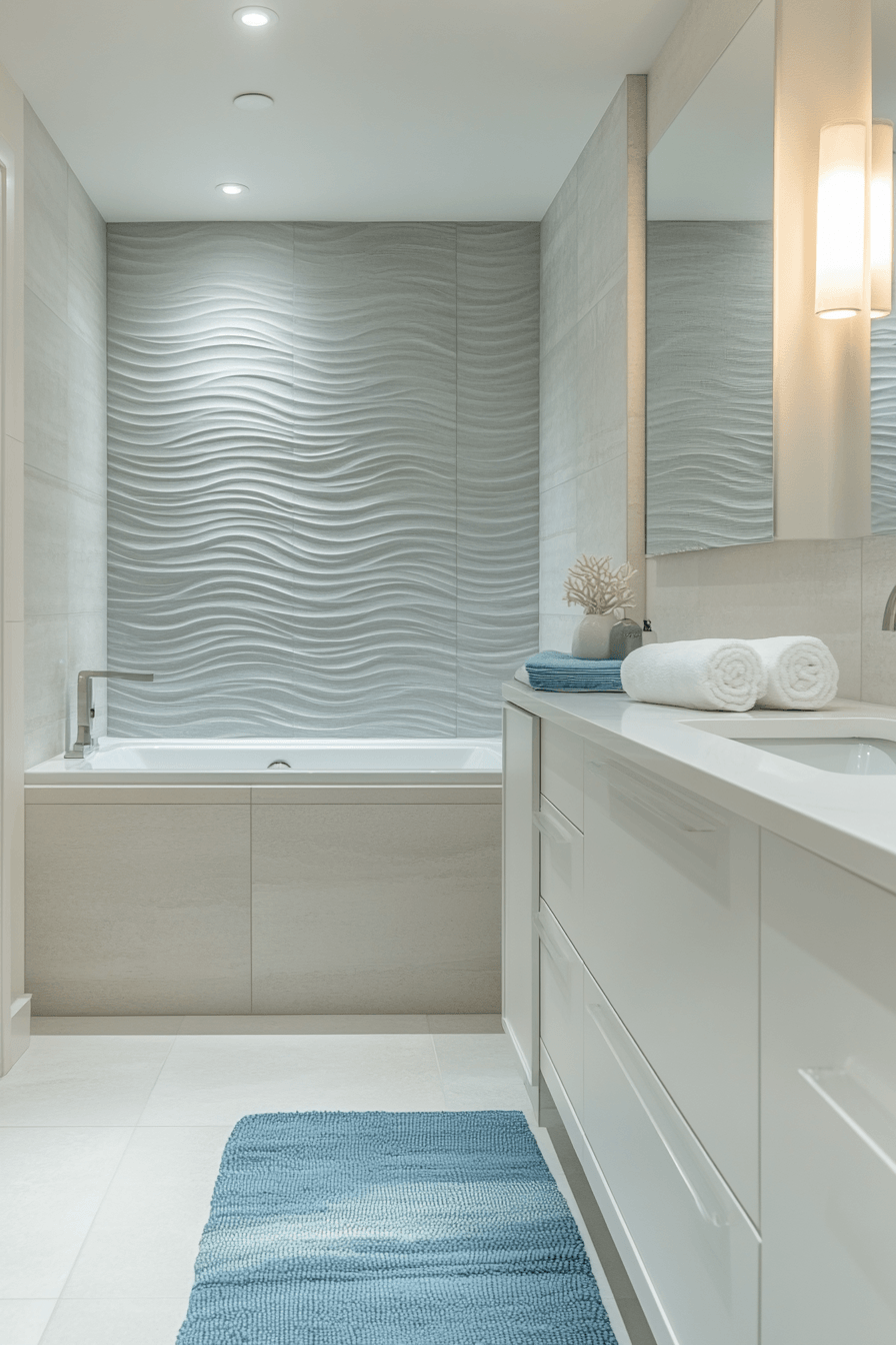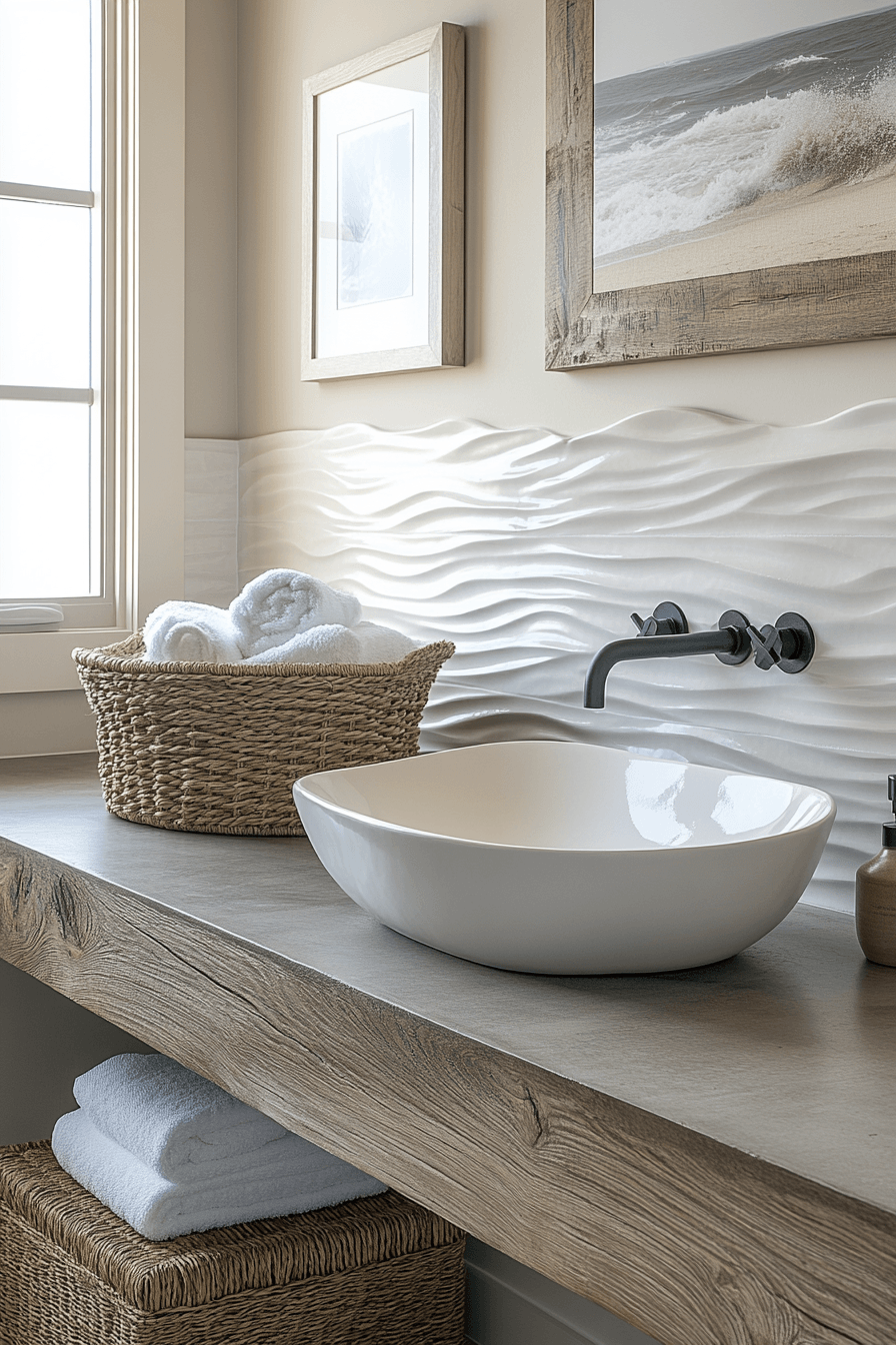 Wave-inspired tile becomes the focal point in this ocean themed bathroom, adding movement and depth to the design. Deep blue ceramics ripple across the shower wall beautifully. A white vanity and soft gray flooring balance the bold feature. Chrome fixtures reflect light for added brightness. Coastal accents complete the look without overpowering it. The space feels dynamic and modern. Create your own tidal-inspired bathroom design!