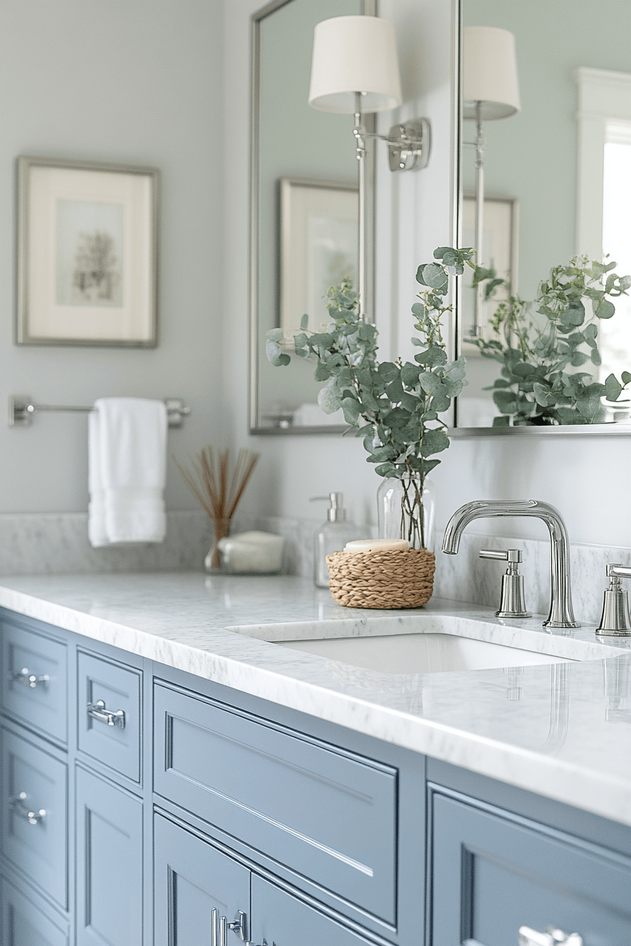 Soft coastal hues create a light and airy ocean themed bathroom that feels effortlessly serene. Pale blues and crisp whites form a calming palette. Weathered wood adds warmth and texture. Chrome finishes reflect light beautifully. Minimal decor keeps the design clean. The space feels fresh and peaceful. Recreate this soothing coastal look in your home!