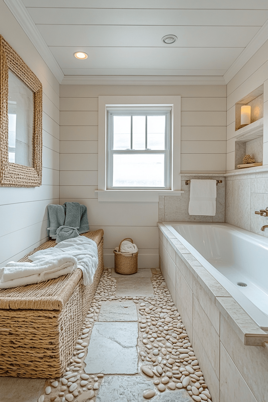 Pebble stone flooring takes the spotlight in this ocean themed bathroom, adding texture and natural beauty. Light blue walls and white tile create a crisp contrast. Warm wood accents bring balance and comfort. Coastal decor is used sparingly for a clean look. The tactile floor adds both style and function. The space feels organic and fresh. Incorporate natural textures into your coastal design!