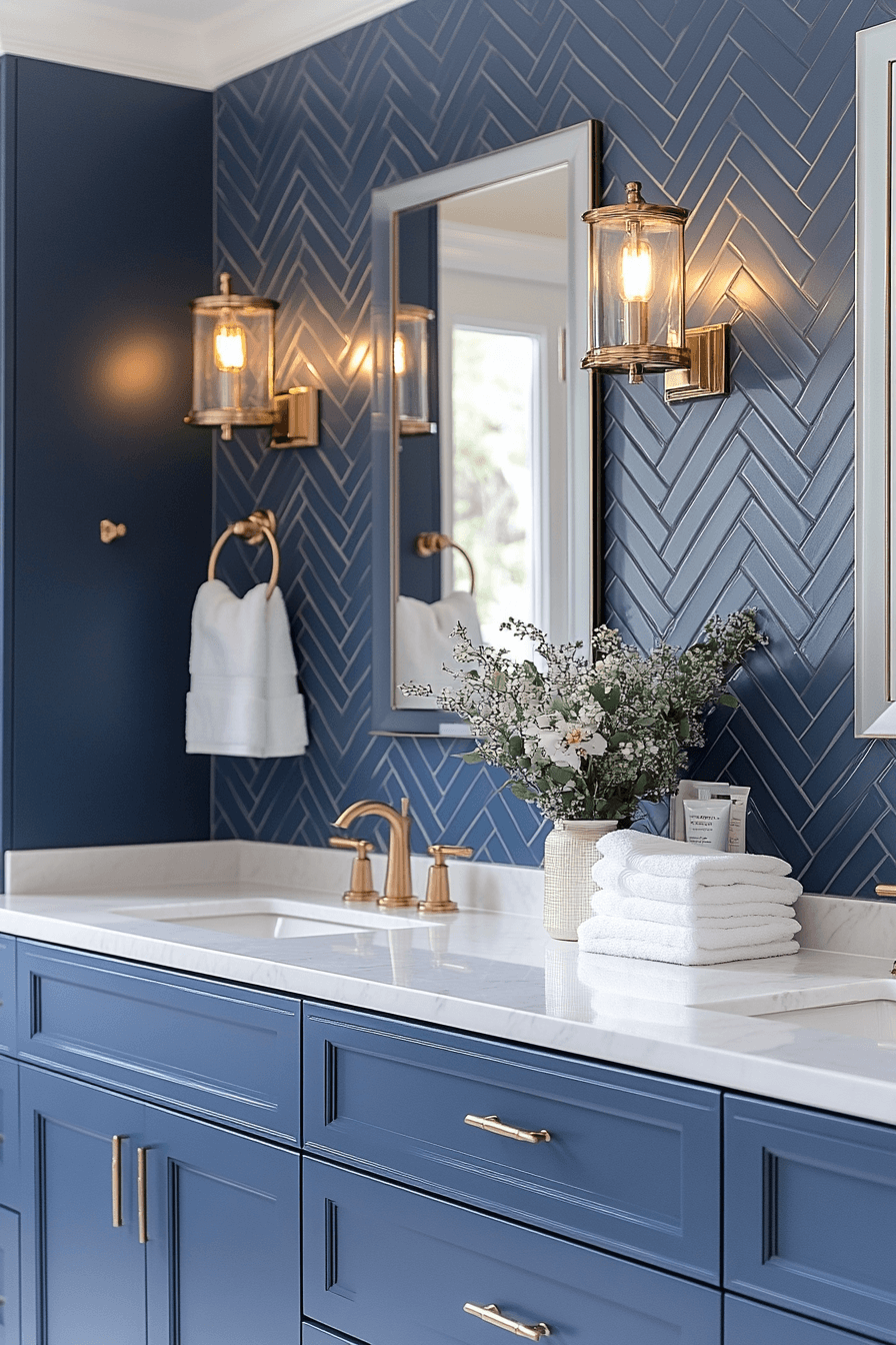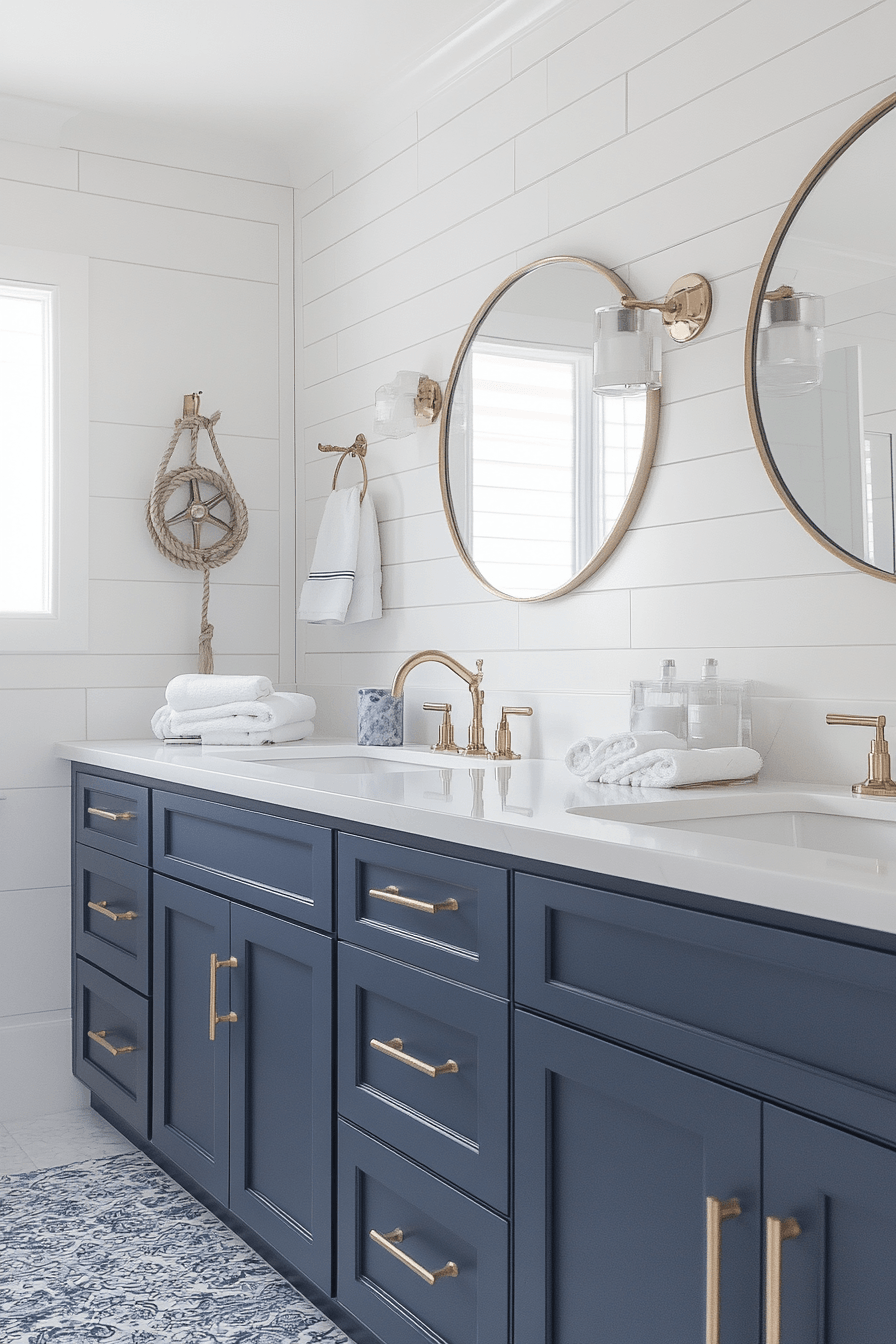 Bold navy tones meet crisp white finishes in this ocean themed bathroom, creating a timeless coastal statement. Striped textiles and subtle nautical accents introduce charm without overwhelming the design. Deep cabinetry and metallic details add depth and elegance. A round mirror and rope-inspired features bring a playful yet polished touch. Textured tiles enhance visual interest while maintaining balance. The overall look feels classic yet elevated. Refresh your space with this striking nautical-inspired style!