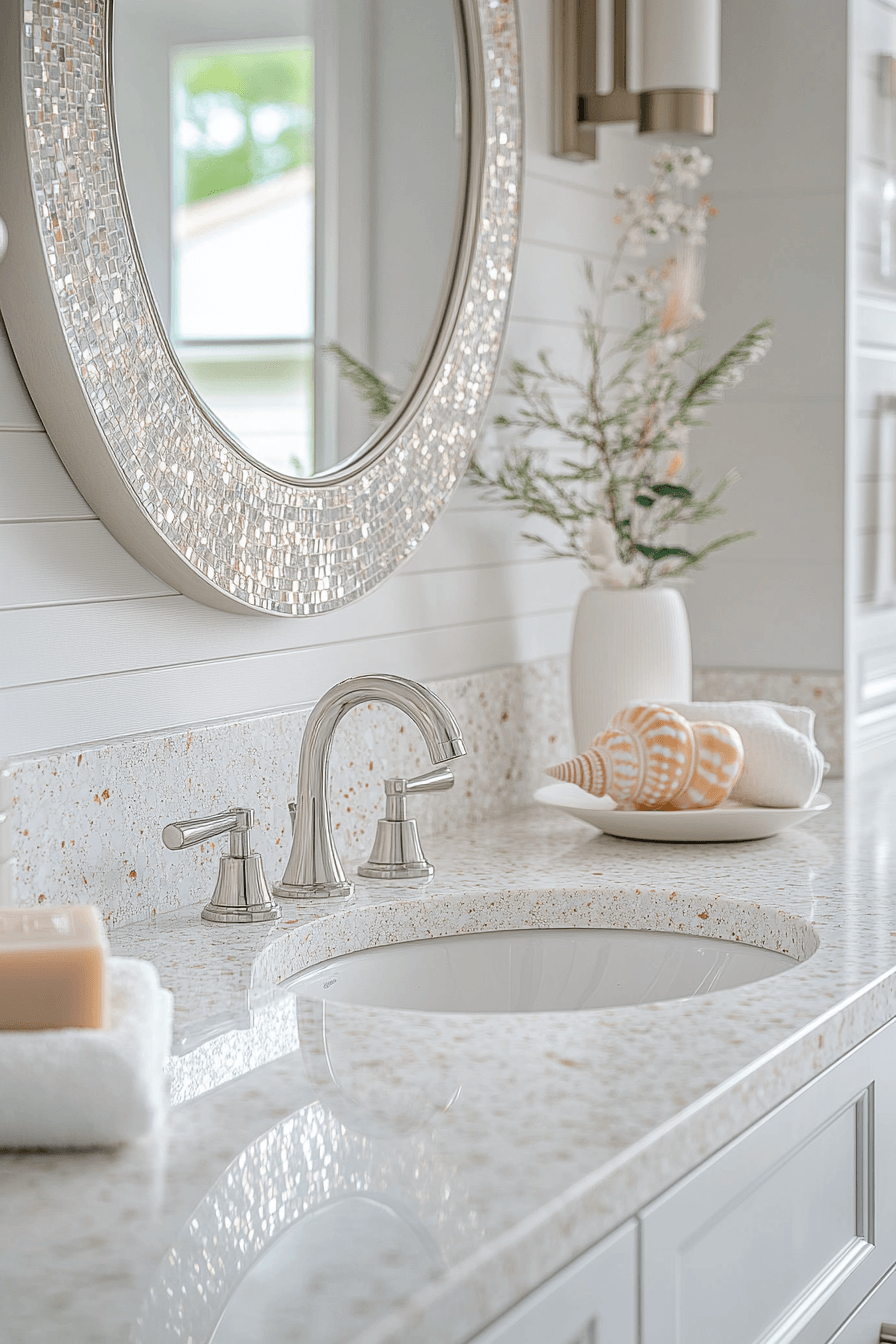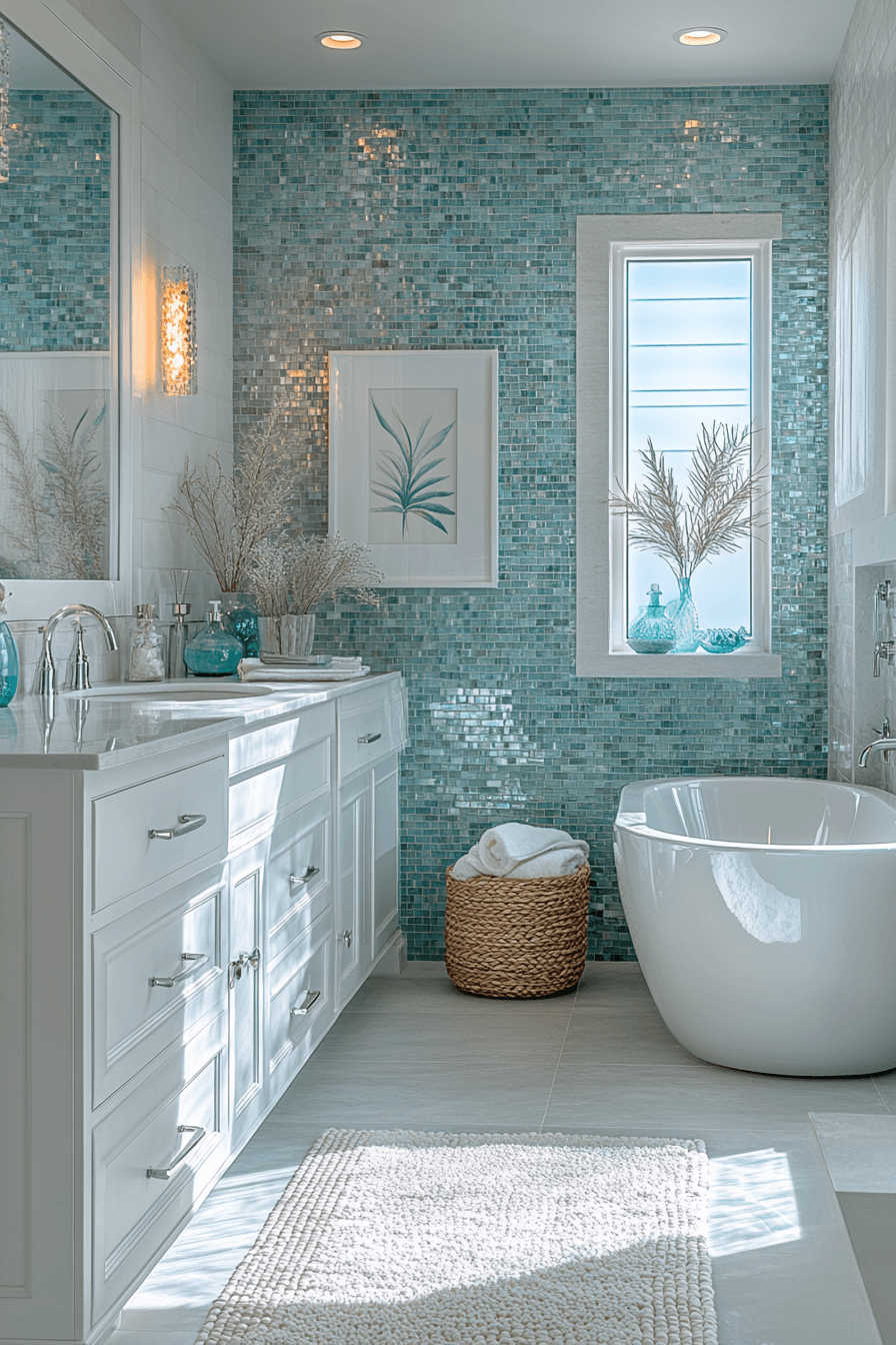 Glass mosaic tiles shimmer in this ocean themed bathroom, reflecting light in beautiful aqua tones. The backsplash adds movement and brightness. A white vanity keeps the look clean and crisp. Chrome fixtures enhance the polished feel. Wave-inspired details tie in the theme. The space feels radiant and fresh. Bring this luminous coastal look into your home!