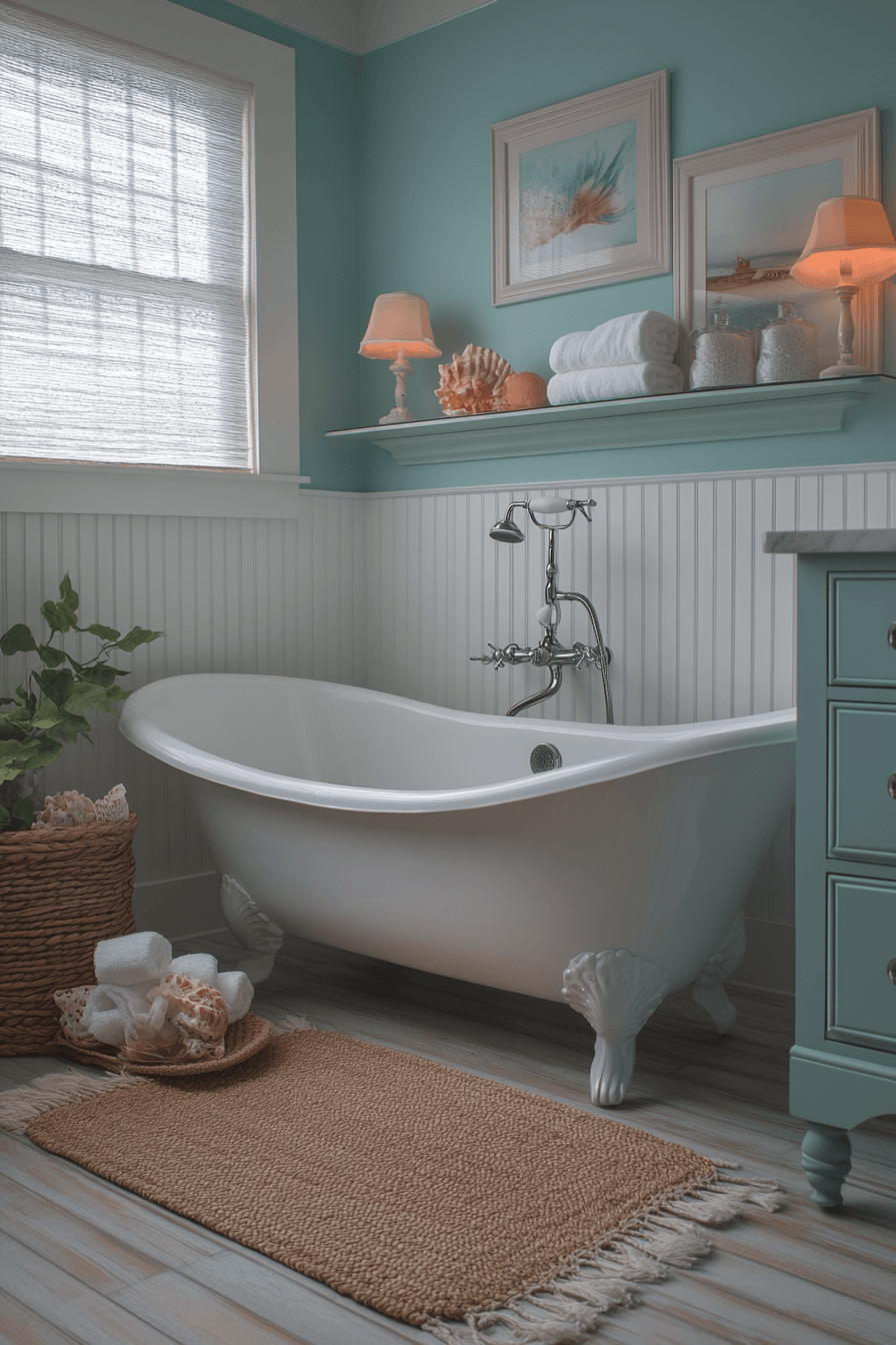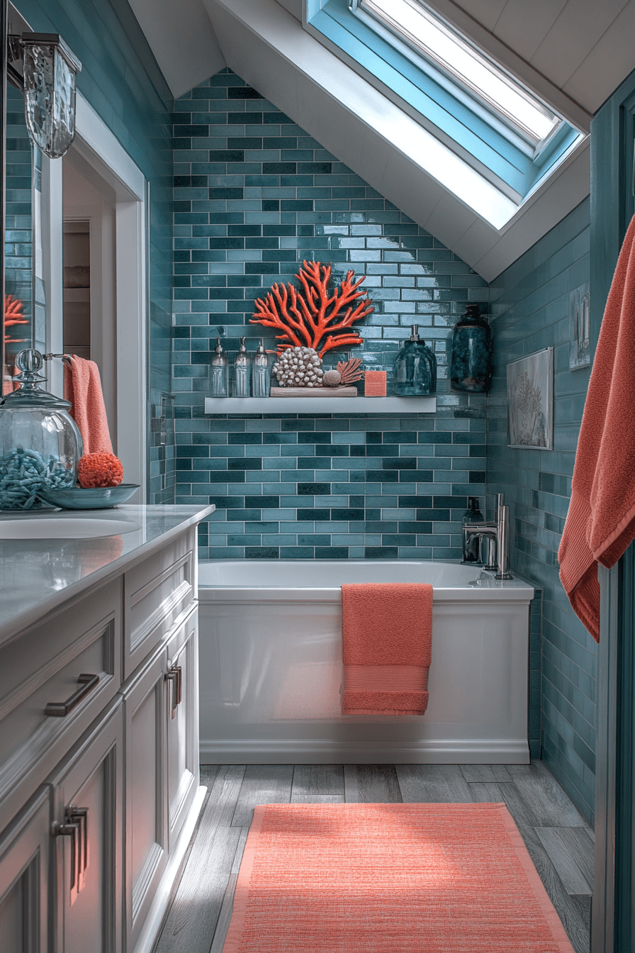 Bold teal and coral accents energize this ocean themed bathroom with a fun and lively palette. A colorful vanity becomes the focal point. Neutral walls keep the design grounded. Clean lines maintain a polished look. Vibrant artwork enhances the personality. The space feels cheerful and modern. Brighten your bathroom with this playful coastal design!