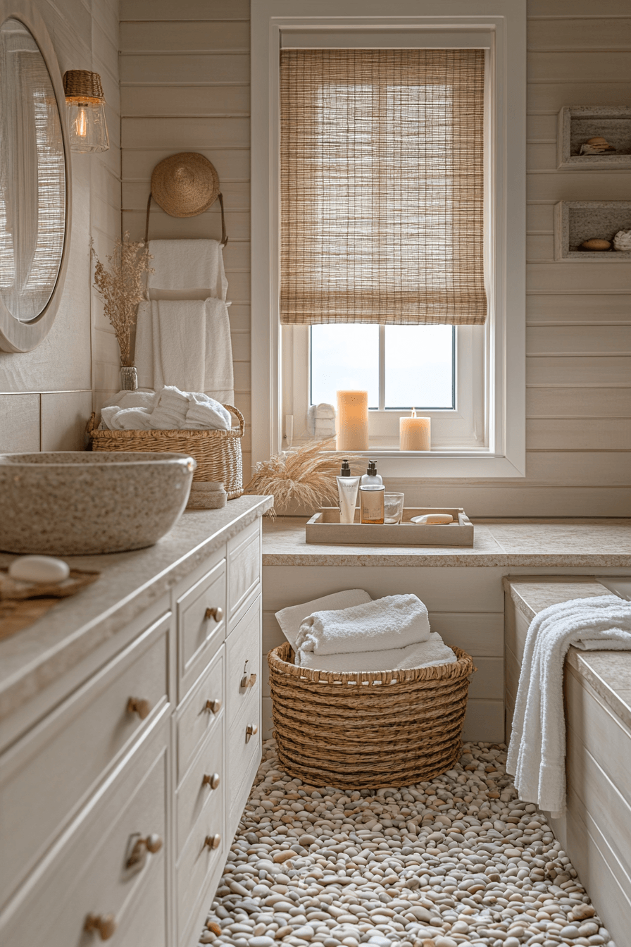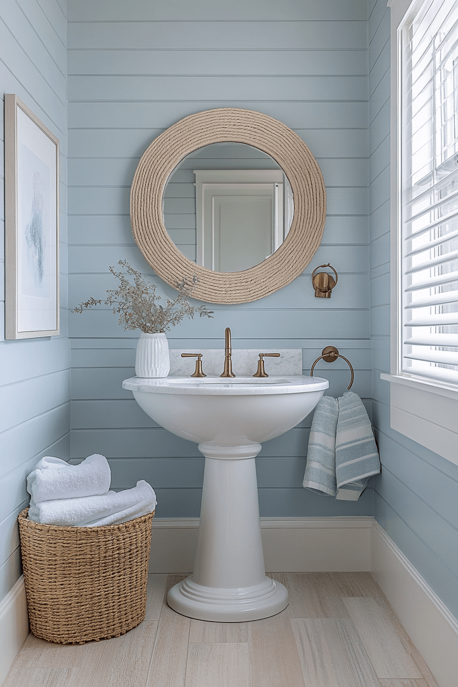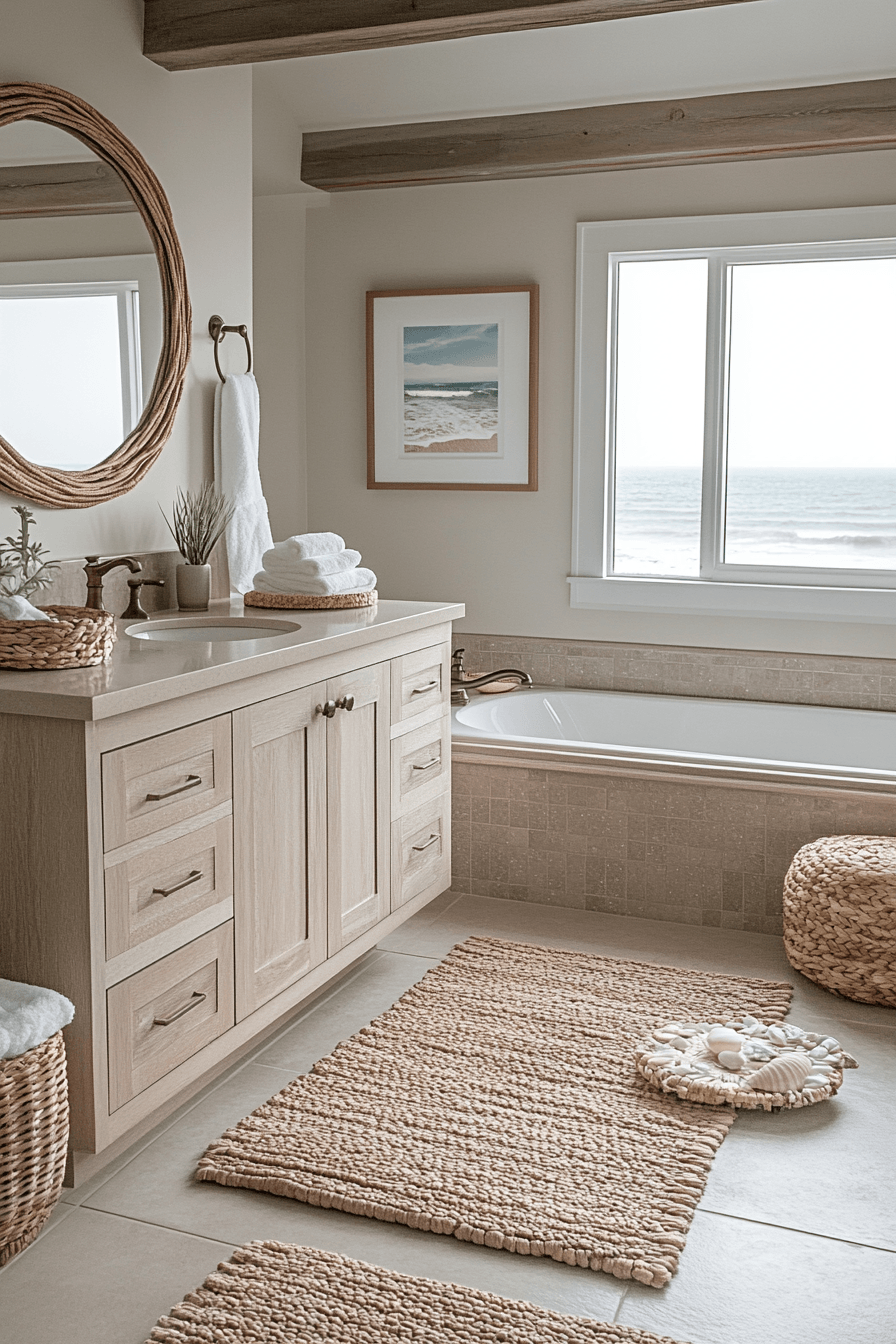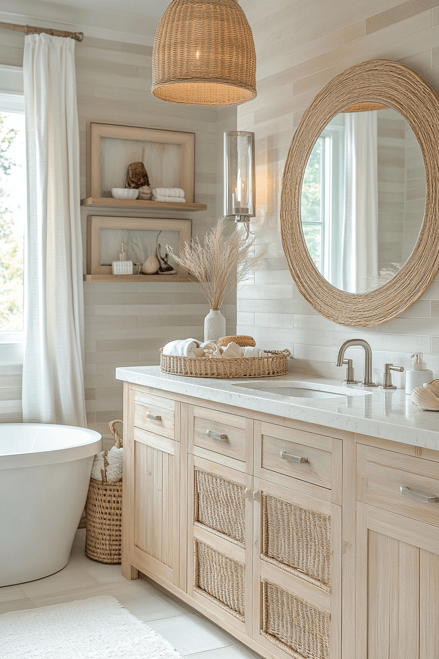 Woven textures and warm finishes define this inviting ocean themed bathroom filled with coastal charm. A rattan mirror pairs with a wood vanity for natural warmth. Soft blue walls balance sandy-toned tiles. Jute rugs and baskets add cozy layers. Brass accents bring subtle elegance. The space feels welcoming and relaxed. Transform your bathroom with this textured coastal style!