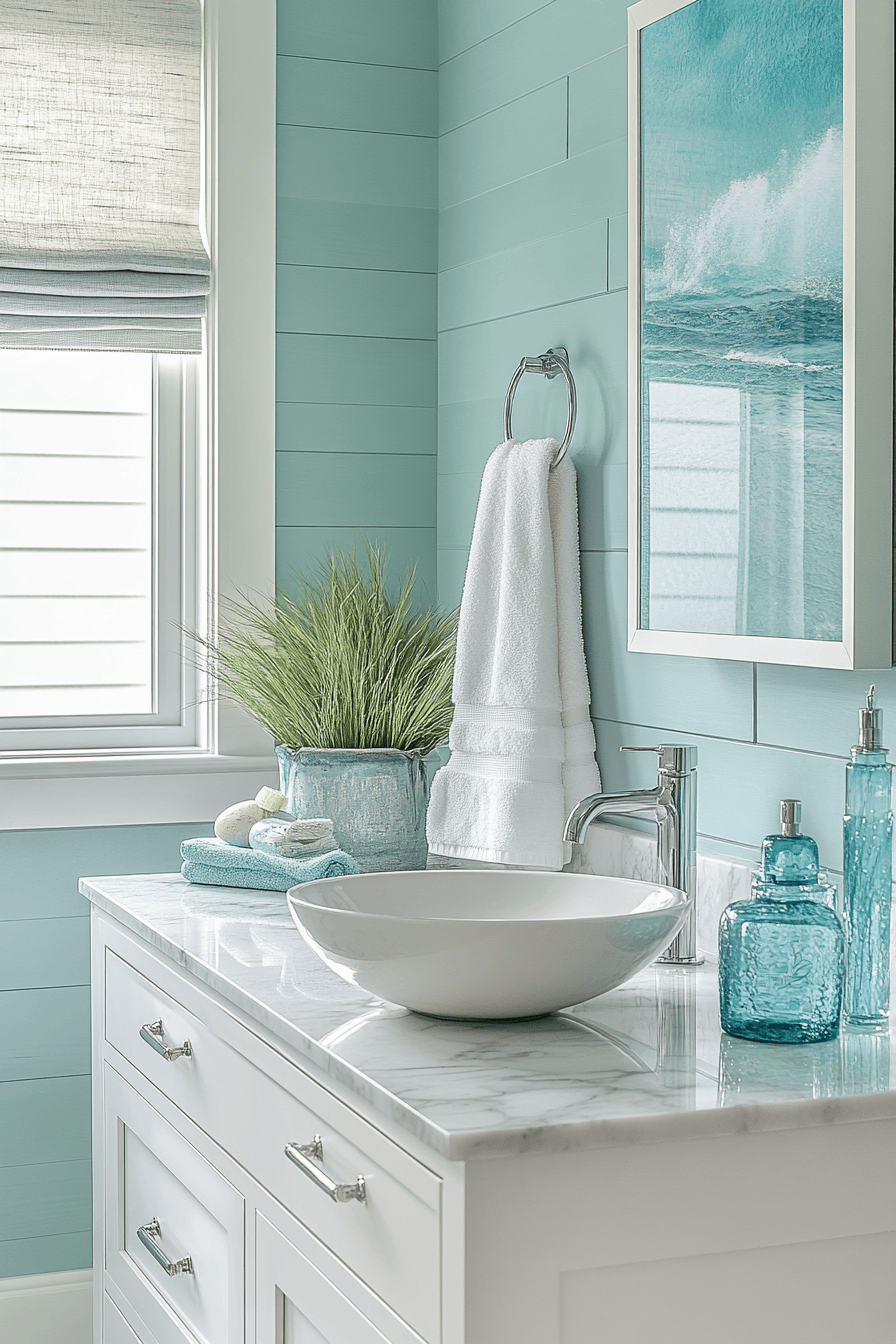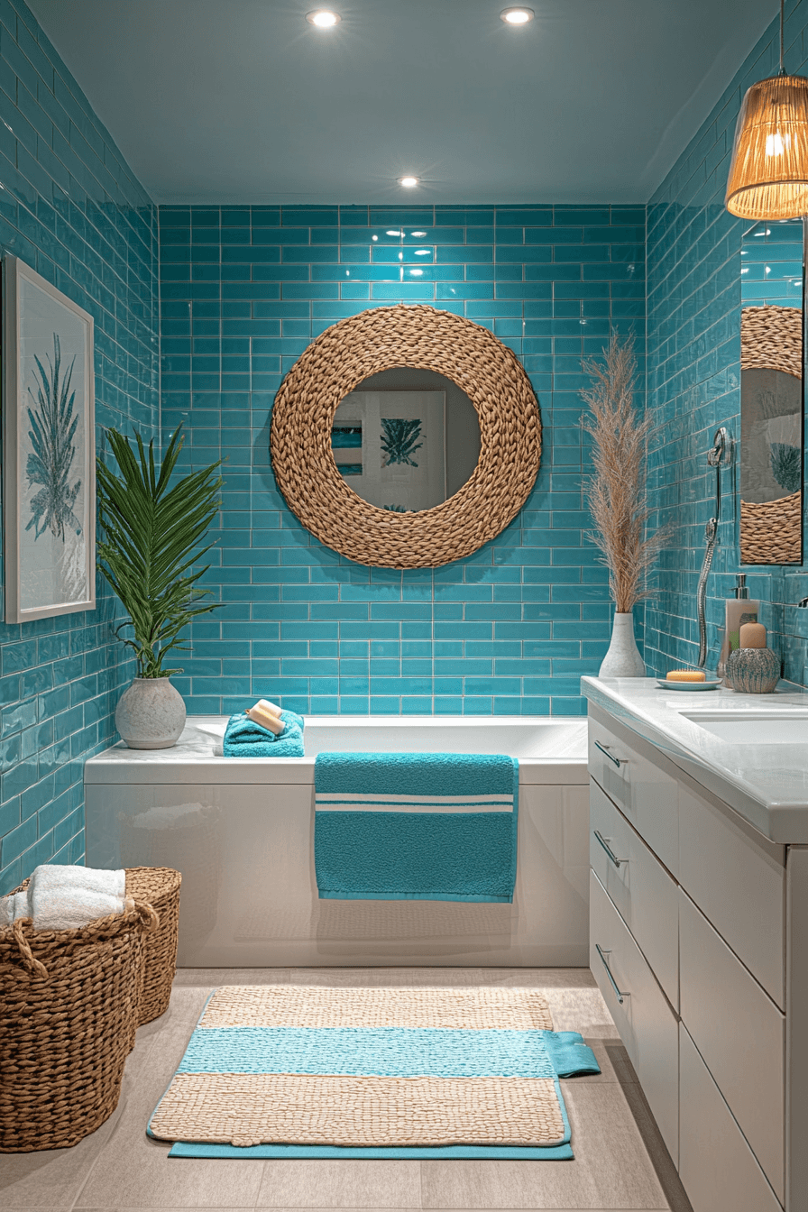 Bright turquoise takes center stage in this ocean themed bathroom, delivering a cheerful and energetic vibe. A bold vanity and accent wall add personality while neutral elements keep the look balanced. Clean white tile and sleek fixtures maintain a modern feel. Playful decor like sea glass and marine artwork adds charm. The overall space feels lively and fresh. Sunlight enhances every vibrant detail. Add a splash of color to your coastal style!