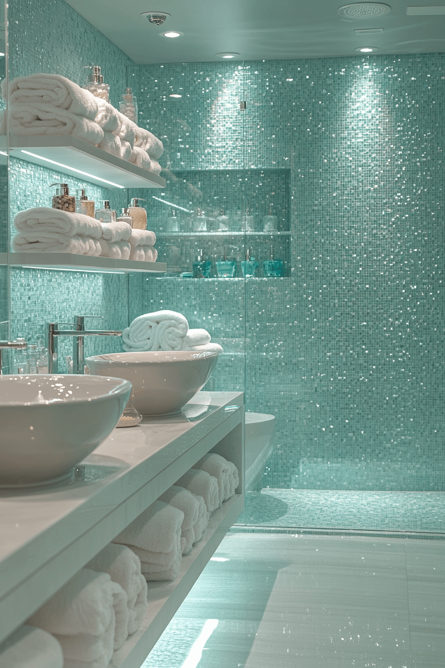 Vibrant glass tiles infuse this ocean themed bathroom with lively aqua and teal tones that shimmer beautifully in the light. Reflective surfaces create a fluid, water-inspired effect across the space. A floating vanity and open shower layout keep everything feeling modern and spacious. Polished finishes enhance the fresh color palette. Sea glass details and coral accents complete the coastal story. The room feels bright and dynamic. Bring this refreshing coastal look into your home!