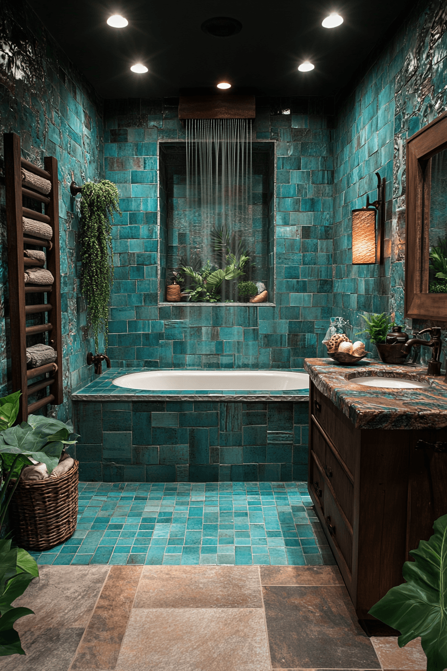 Deep teal hues create a bold lagoon-inspired ocean themed bathroom filled with richness and depth. Natural wood and stone elements ground the palette. Layered tiles mimic flowing water beautifully. Gold accents elevate the design. The atmosphere feels vibrant yet calming. Every detail feels intentional. Turn your space into a tropical-inspired retreat!