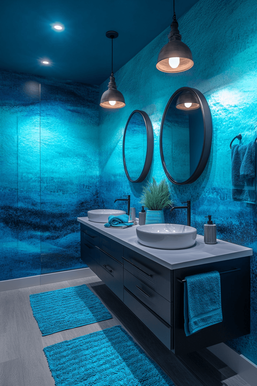 An ombré wall blends seafoam into deep blue in this ocean themed bathroom, creating a stunning focal point. The gradient effect feels modern and immersive. A floating vanity keeps the design sleek. Subtle lighting enhances the color transition. Minimal decor allows the wall to shine. The overall look feels bold yet calming. Bring this gradient coastal beauty into your space!