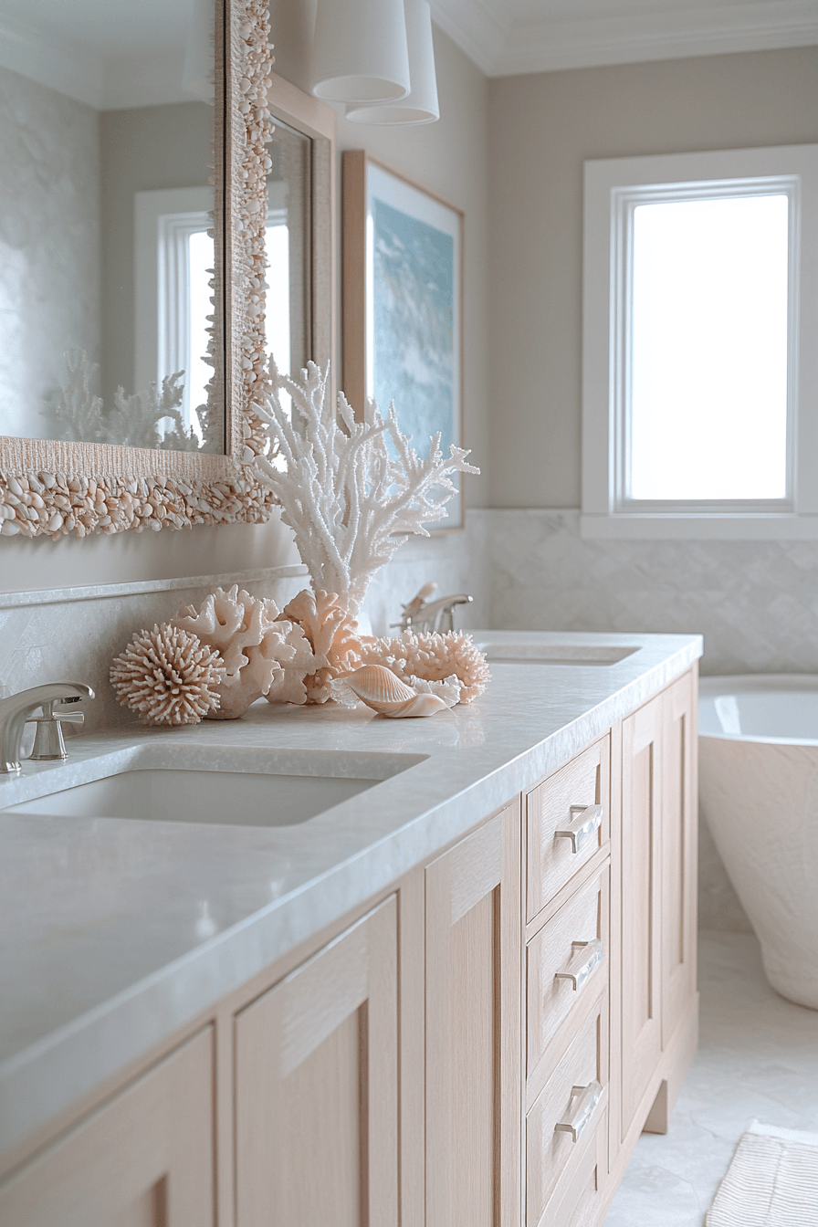 Shell-inspired details add charm to this ocean themed bathroom while keeping the overall look sleek and modern. A glass shower highlights a subtle feature wall. Soft beige tones maintain an airy feel. Floating elements add a contemporary touch. Coastal accents enhance the design without clutter. The space feels light and refined. Bring subtle seaside elegance into your home!