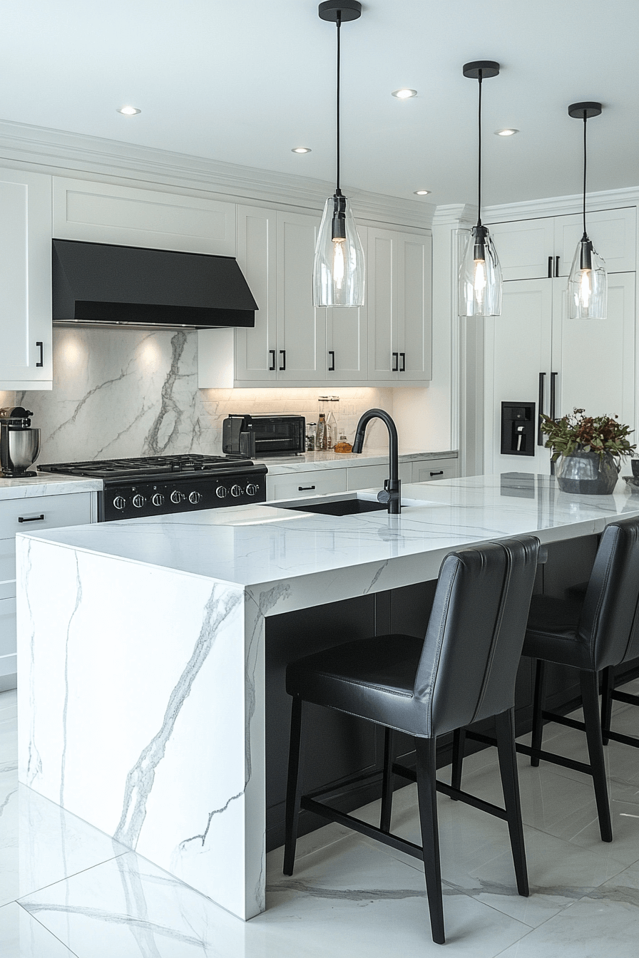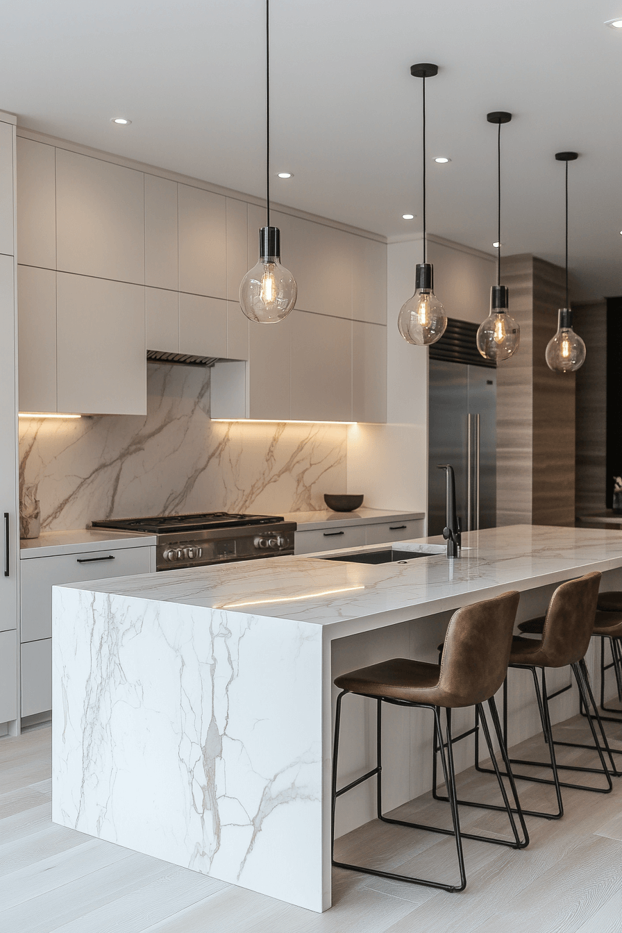 - Furniture: Streamlined kitchen island with waterfall marble countertop, slim bar stools with brushed silver legs