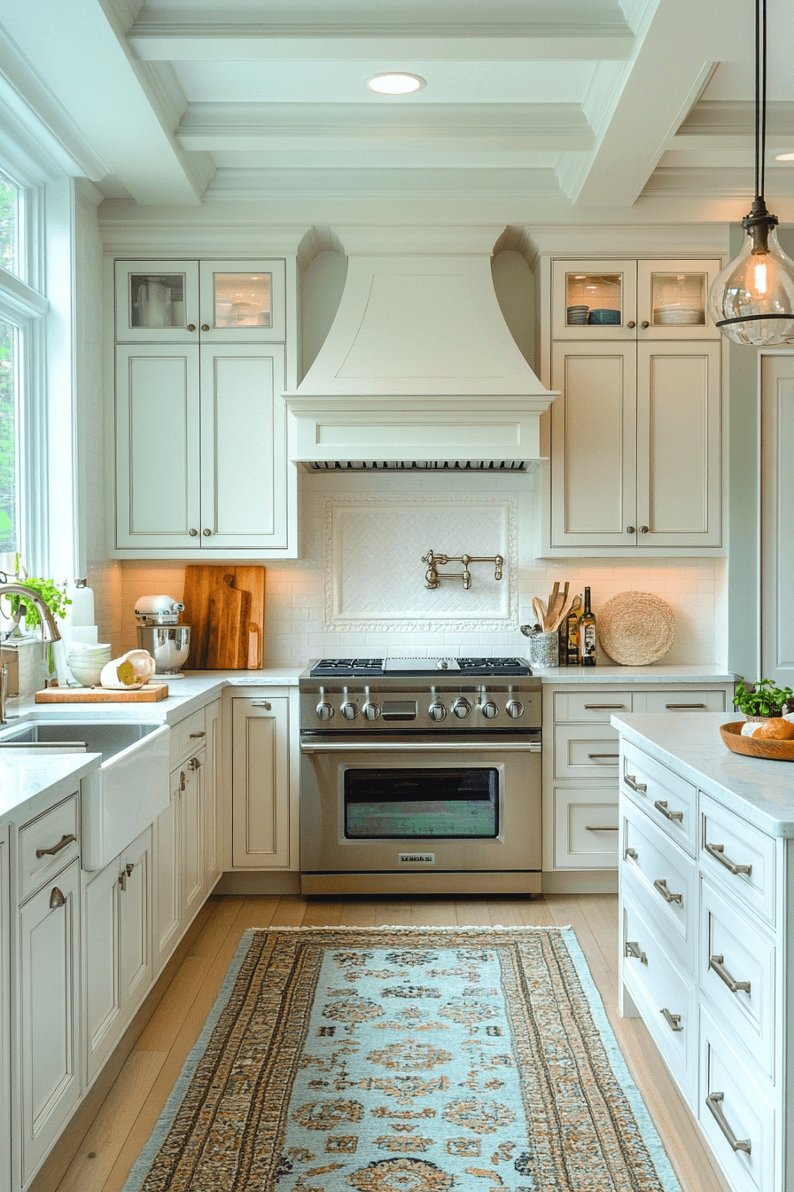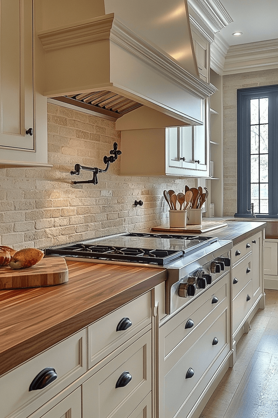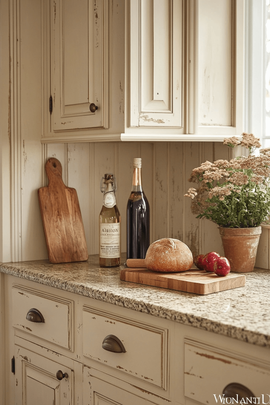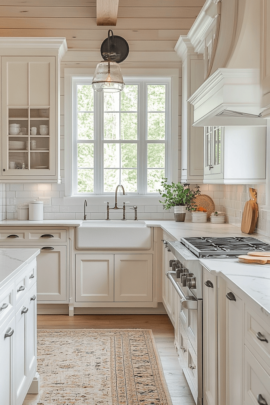 - Materials: chalky matte cabinet finish, hand-hewn ceiling beams, brushed nickel or oil-rubbed bronze hardware, natural linen textiles, unglazed terracotta or zellige tile backsplash