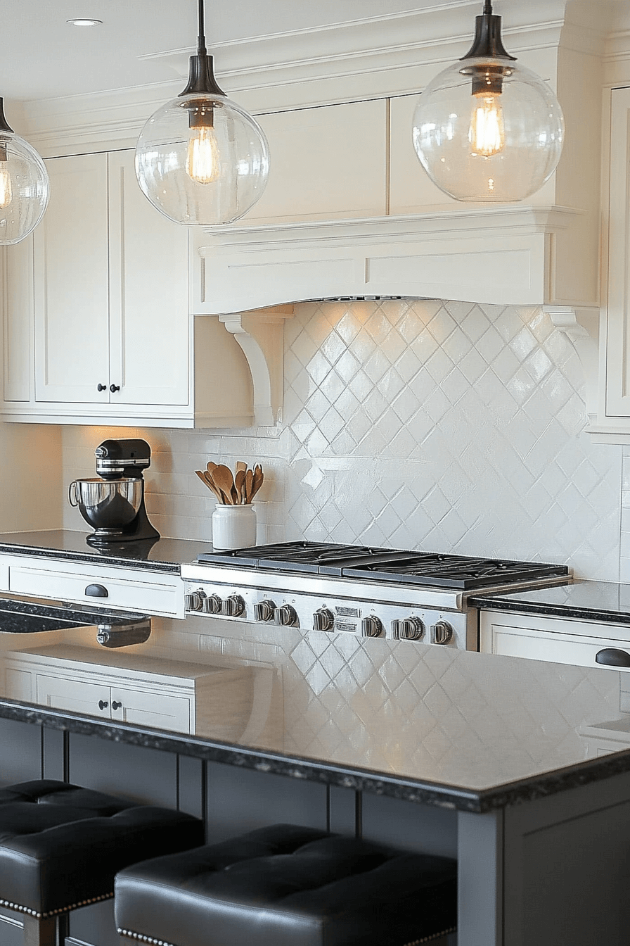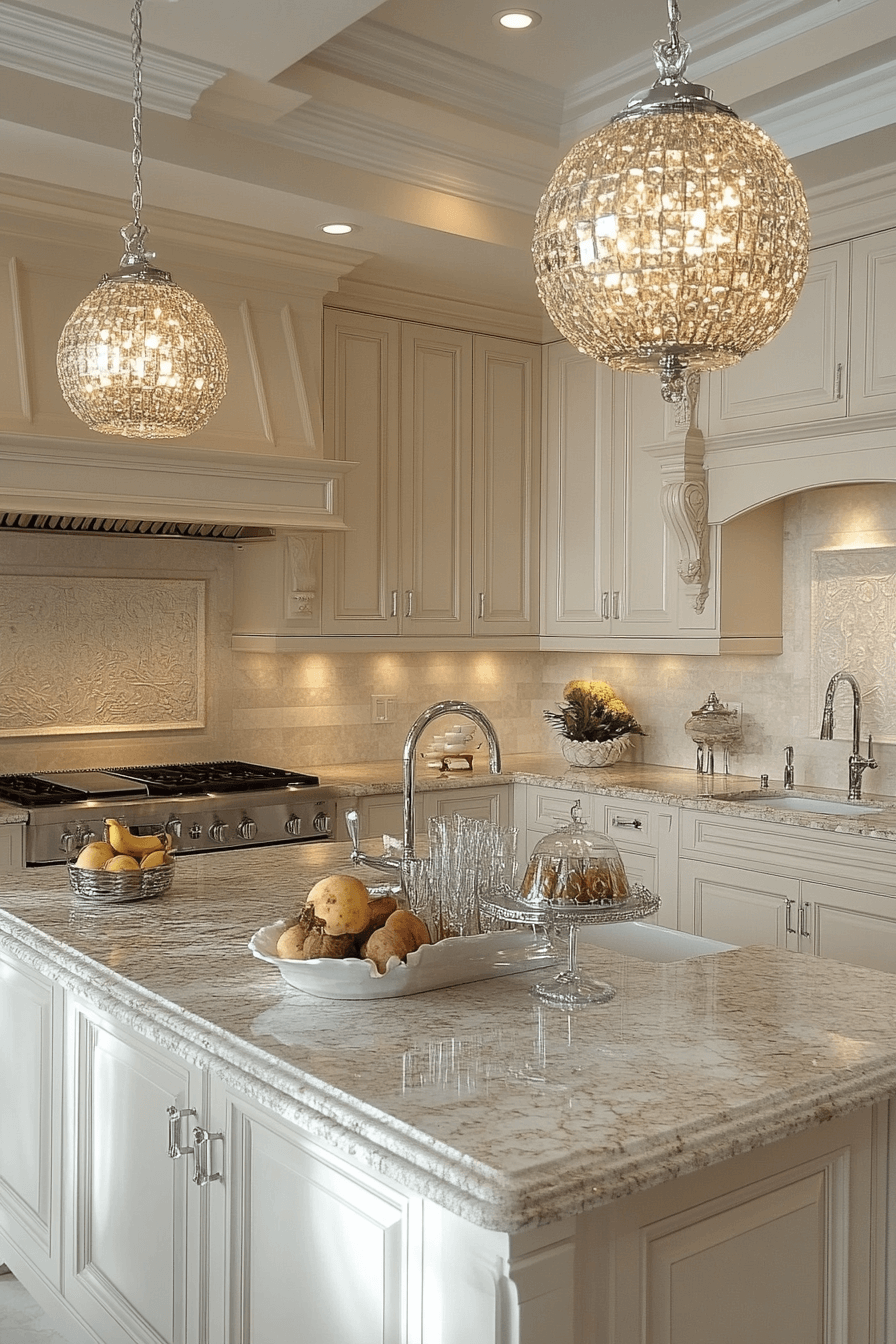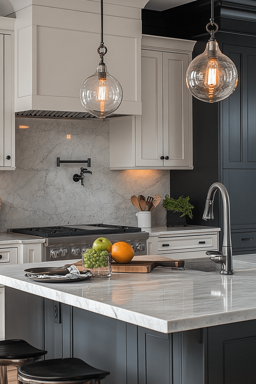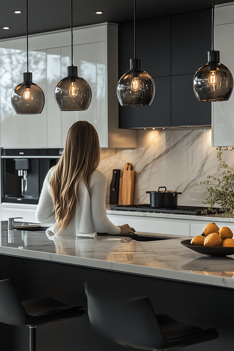 - Lighting: Sculptural opal glass globe pendants with warm dimmable LEDs, hung in asymmetrical cluster over island