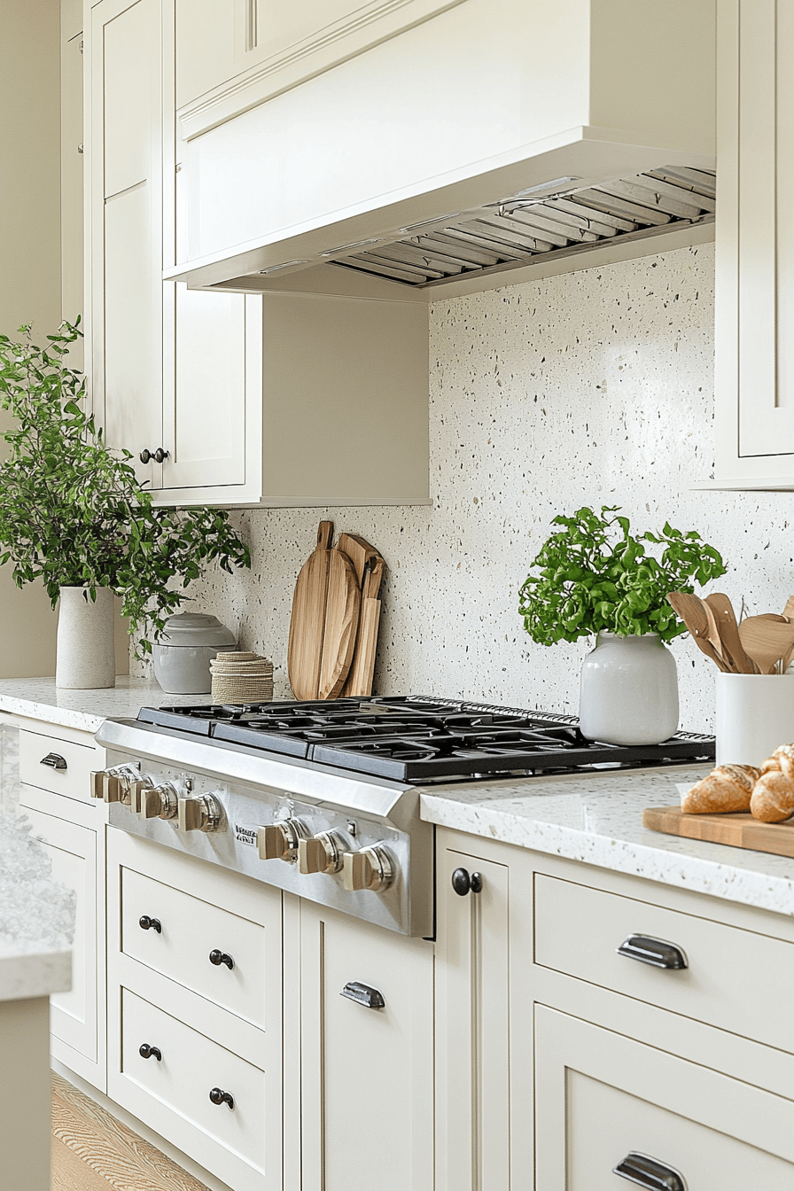 - Furniture: Flat-panel off white base cabinets with integrated pulls, slim waterfall-edge quartz island
