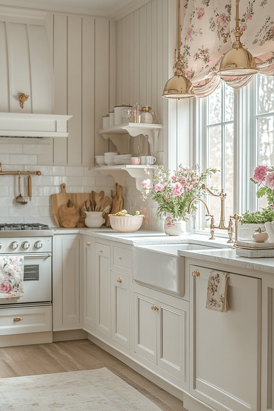 - Materials: chiffon-textured roman shades, marble-look quartz countertops, distressed whitewashed wood open shelving, soft linen tea towels