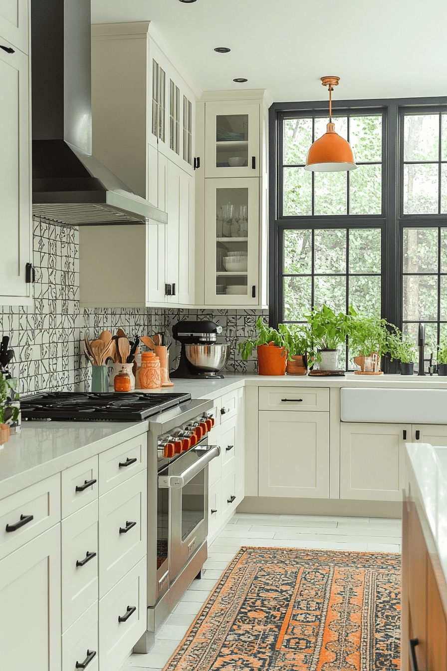 - Materials: matte off-white lacquer cabinet fronts, reclaimed oak countertops, hand-thrown ceramic tile backsplash, jute runner, unbleached linen curtains