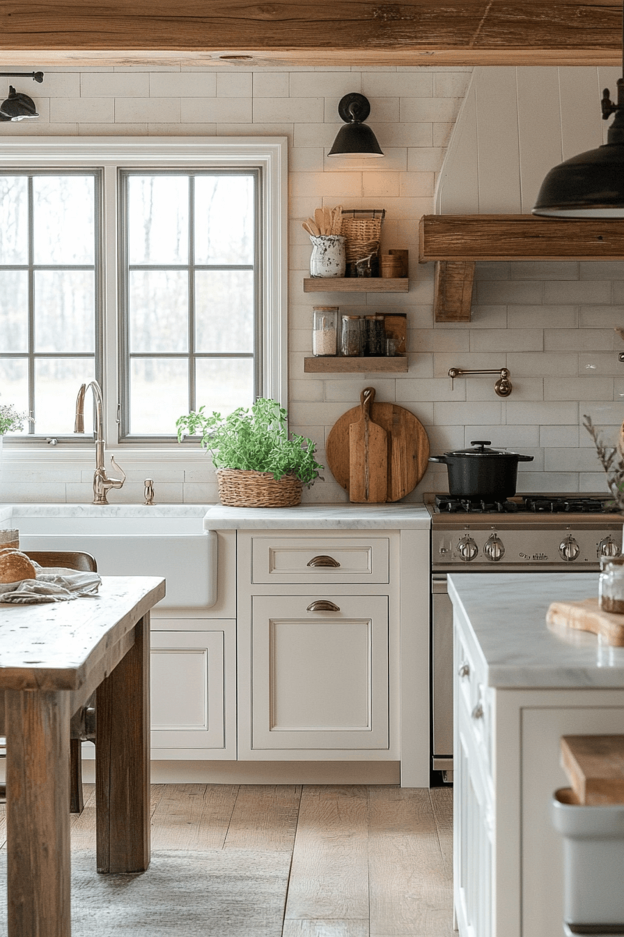 - Furniture: Shaker-style off white kitchen cabinets with warm vanilla undertones, natural oak open shelving, and a farmhouse dining table with turned legs