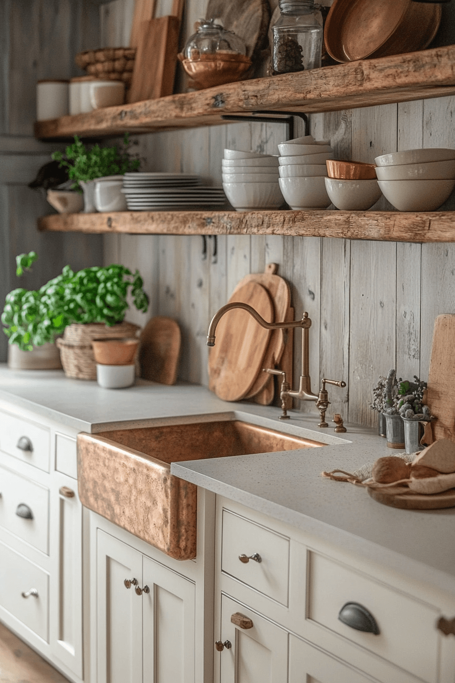 - Furniture: farmhouse apron-front sink in fireclay or cast iron, reclaimed wood open shelving, vintage-inspired bar stools with woven rush seats