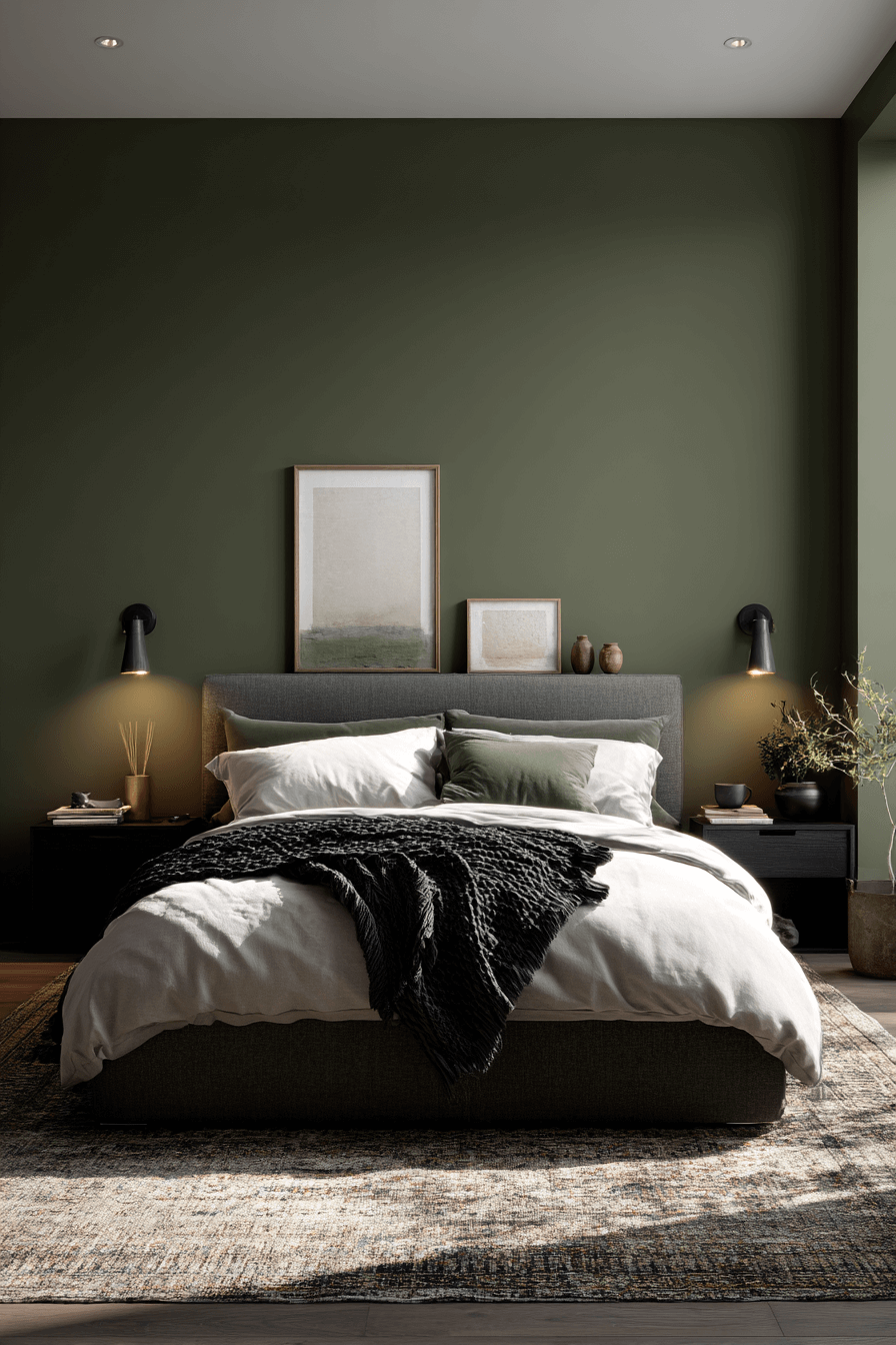 Deep olive walls create an olive green bedroom that feels instantly enveloping and sophisticated. The richness of the shade makes warm lighting glow beautifully against the backdrop. Layer charcoal textiles, dark metals, and natural wood to add depth without heaviness. The color grounds the entire space while still feeling modern and refined. Soft layered bedding enhances the cocoon effect even more. Explore how to create this dramatic retreat in your own home today.