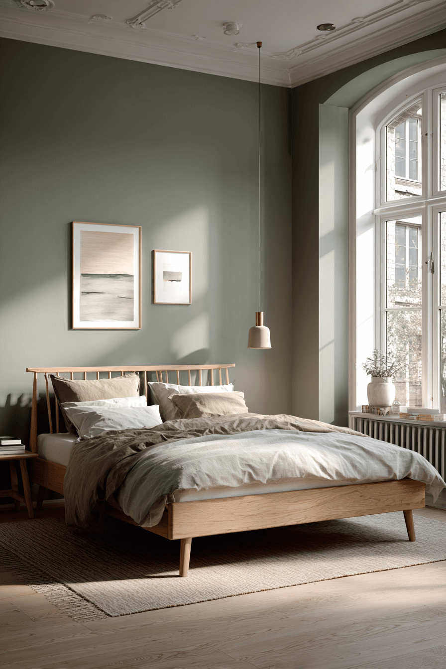 Scandinavian influence pairs beautifully with an olive green bedroom palette. Light oak furniture and crisp white linens balance the richness of the green. Minimal styling keeps the space open and breathable. Olive adds warmth without overpowering the clean aesthetic. Soft throws and subtle decor complete the look effortlessly. Bring Nordic calm into your bedroom now.