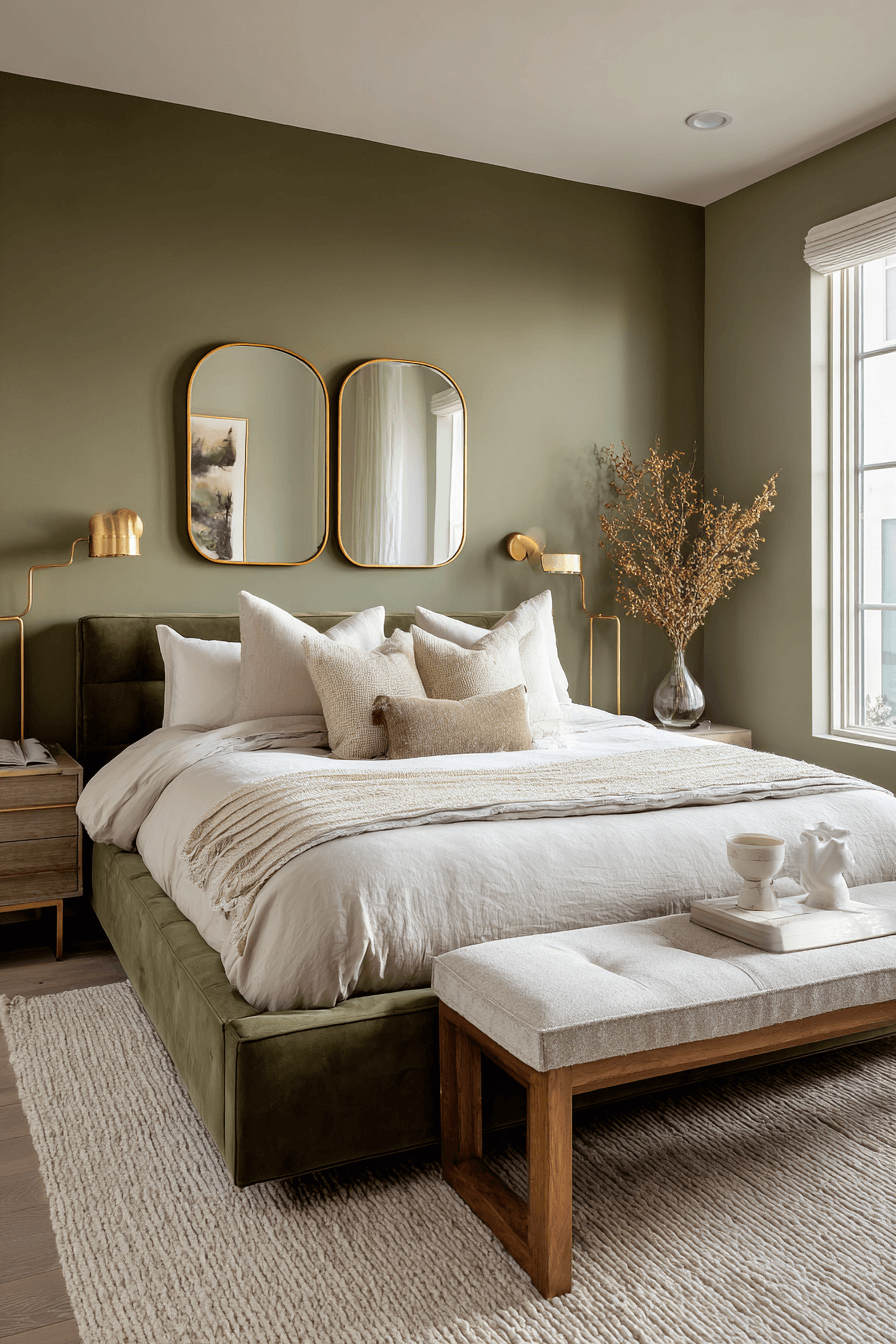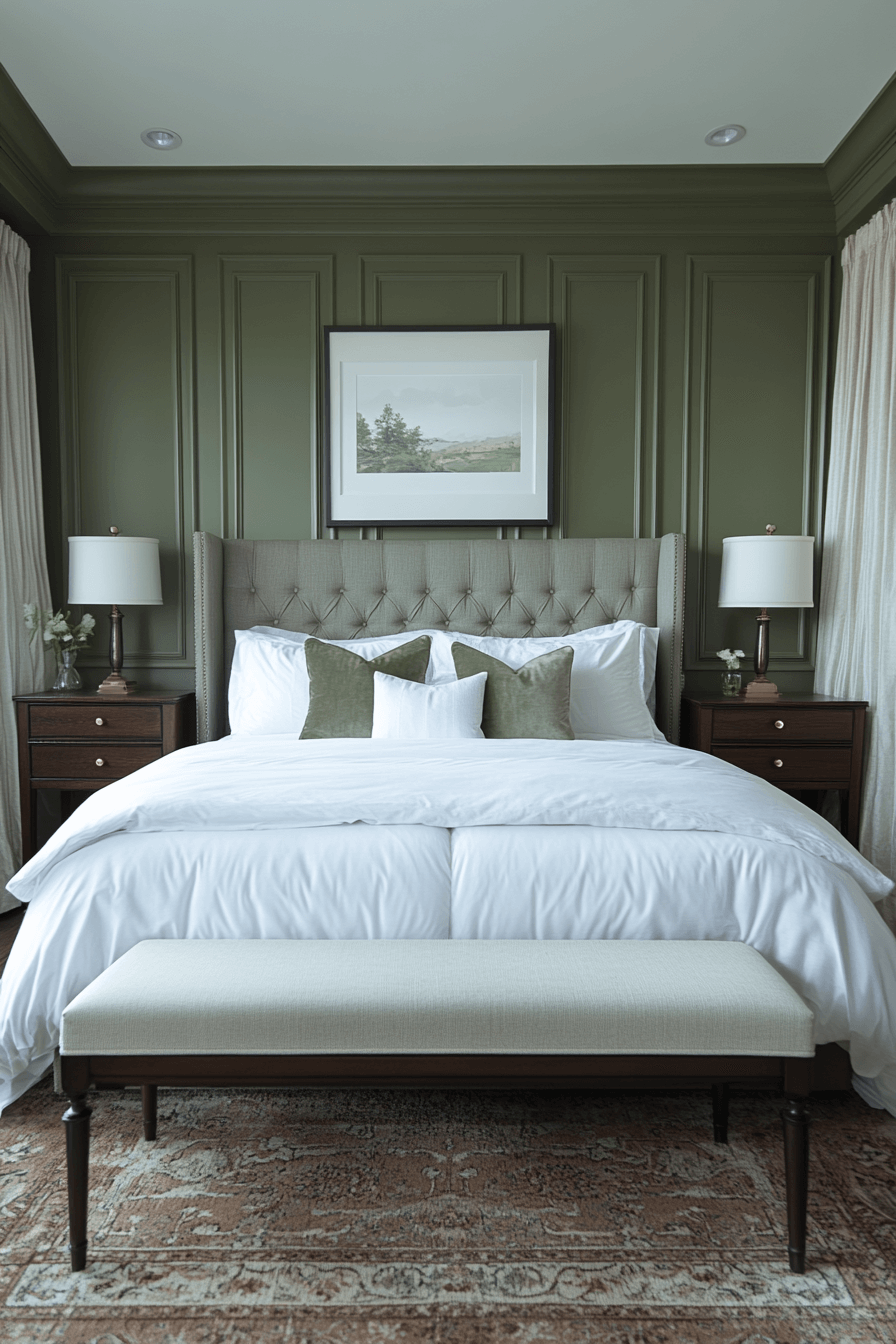 Hotel inspired symmetry elevates an olive green bedroom to boutique level style. Crisp bedding, matching nightstands, and layered lighting create polish. Olive adds sophistication and warmth instantly. Plush textiles complete the upscale feel. The design feels intentional and refined. Bring five star comfort into your bedroom today.