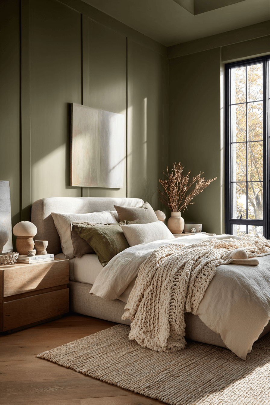 Layered bedding and warm wood finishes turn an olive green bedroom into the ultimate comfort zone. Olive walls provide a soothing foundation that enhances soft textiles. Warm lighting deepens the cozy atmosphere. Even simple decor feels intentional against the rich shade. The space invites rest and relaxation. Create your own comforting sanctuary today.